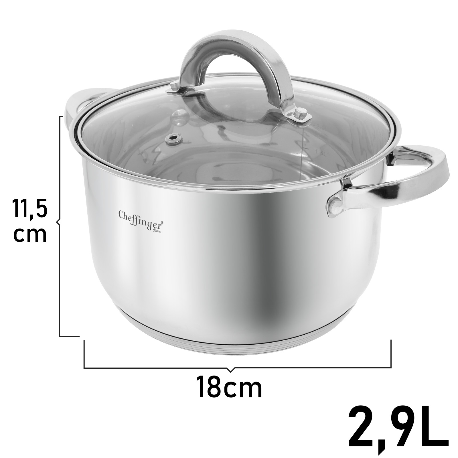 18 cm Cheffinger on ihanteellinen kumppani nopeaan ja terveelliseen ruoanlaittoon. Se on valmistettu korkealaatuisesta ruostumattomasta teräksestä, jakaa lämmön tasaisesti ja sopii kaikille keittolevyille, myös induktioliedelle. Sen höyrynpoistolla varustettu lasikansi takaa hallitun kypsennyksen. Reilun 2,9 litran tilavuus jokapäiväisiä ruokia varten.