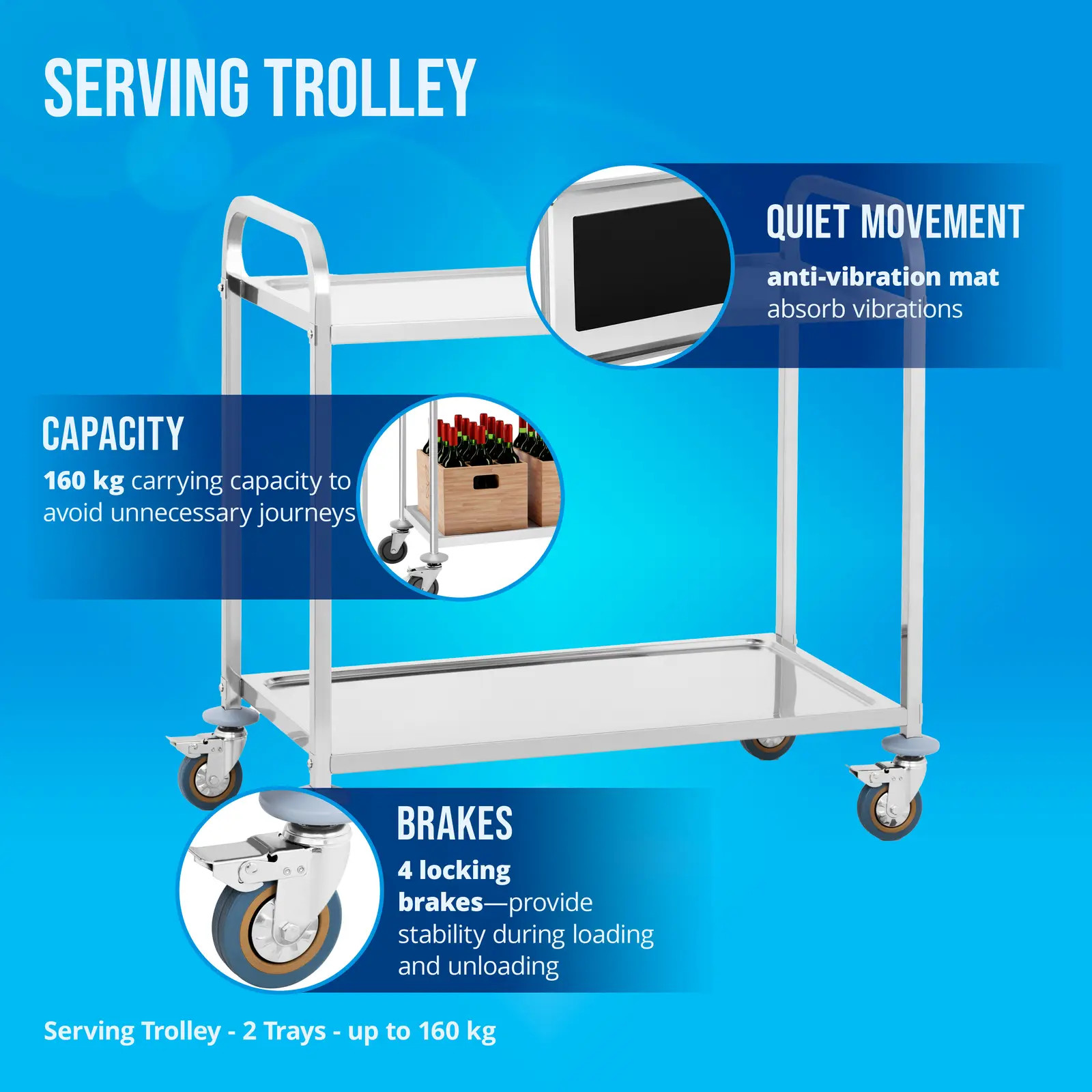 2-hyllyinen ruostumattomasta teräksestä valmistettu tarjoilijakärry
