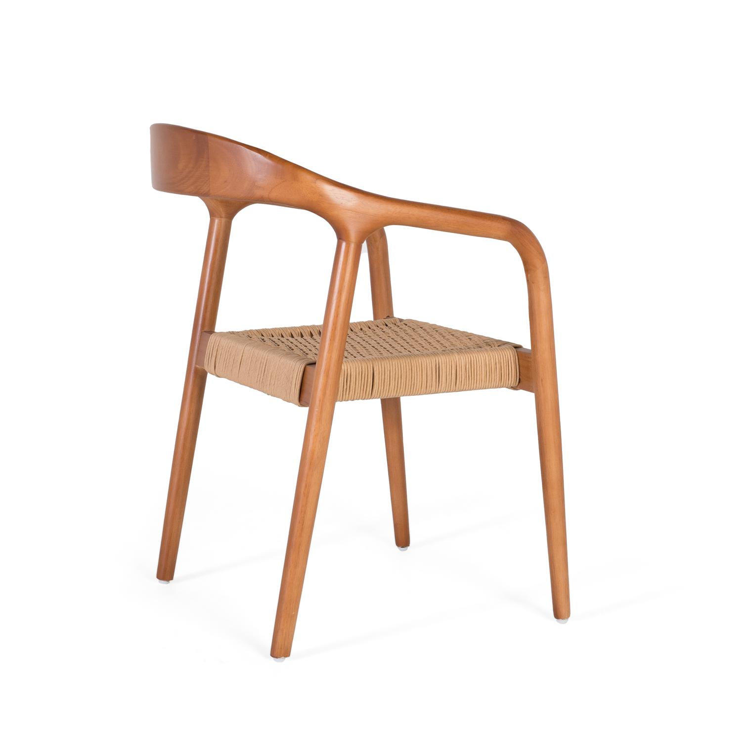 Kahden nojatuolin setti on valmistettu kumipuusta ja petsattu elegantilla hasselpähkinän sävyllä, joka korostaa puun lämpöä. Klassisessa ja ajattomassa muotoilussa on hevosenkengän muotoinen selkänoja, joka tarjoaa mukavuutta ja omaleimaista ilmettä. Istuimet on valmistettu luonnonvalkoisesta köydestä, joka on kudottu herkällä mutta kestävällä kuviolla, joka tarjoaa tukevan ja mukavan tuen. Jalan korkeus: 37 cm. Selkänojan mitat: 36 x 43 cm. Istuimen mitat: 41 x 38 cm.