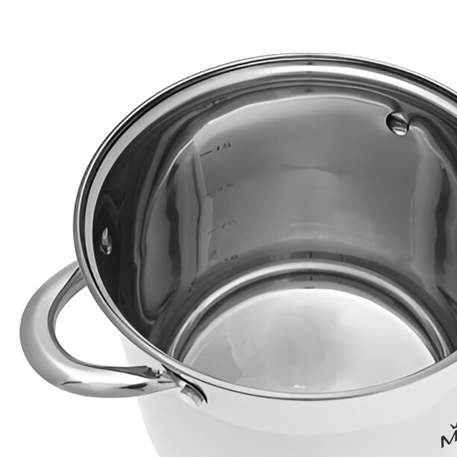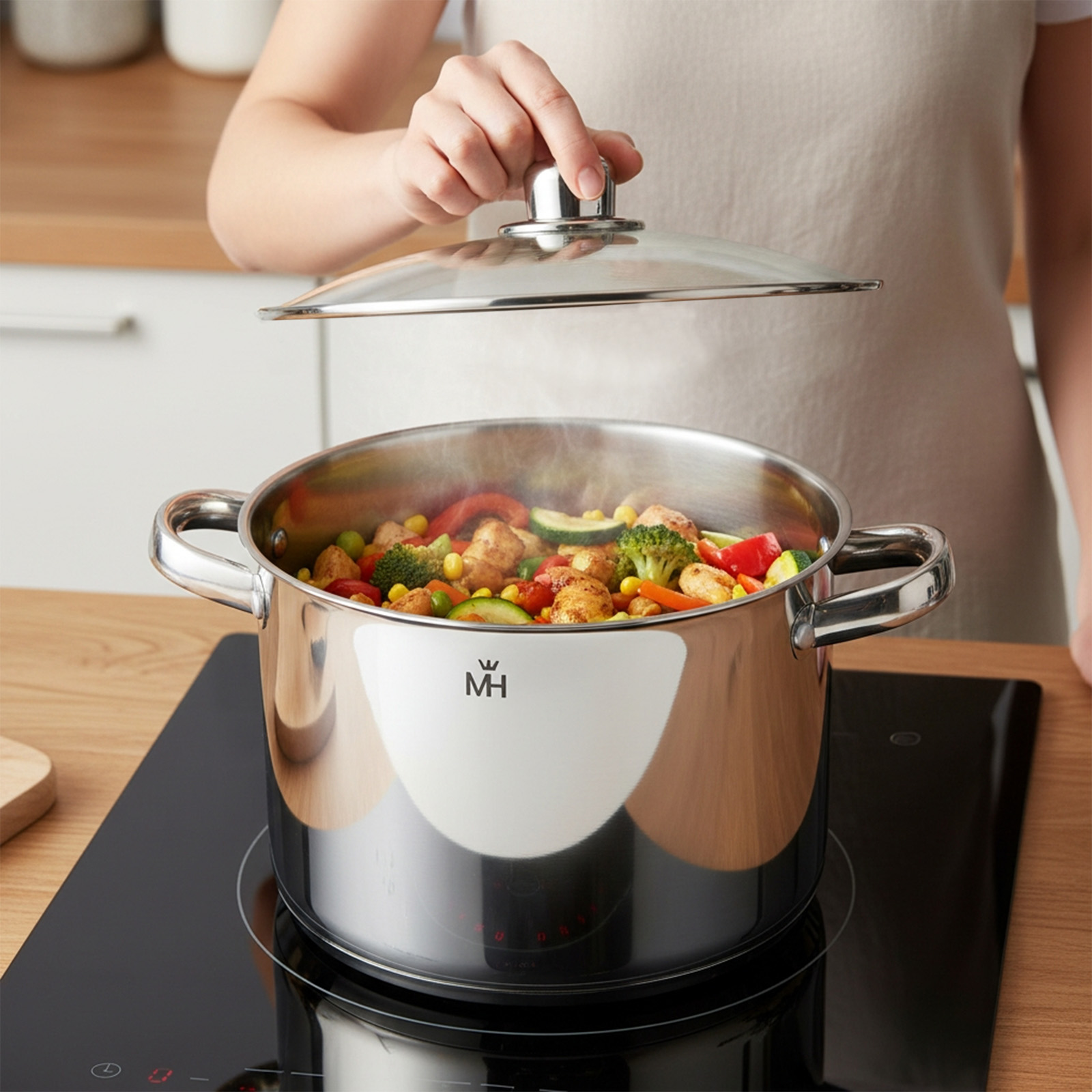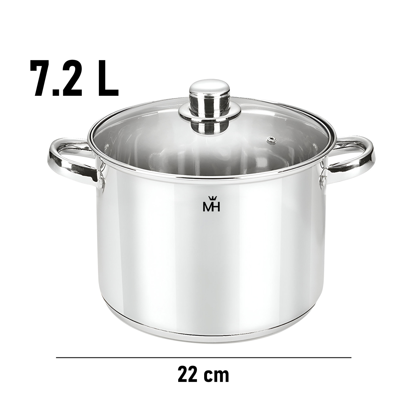 Tässä 22 cm:n kattilassa, joka on valmistettu ruostumattomasta teräksestä 18/10, on 7,2 litraa tilavuutta, ja se on ihanteellinen hauduttamiseen, keittämiseen tai suurten annosten valmistamiseen. Sen koteloitu pohja takaa tasaisen lämmönjakautumisen kaikista lähteistä, myös induktiosta. Karkaistun lasikannen ansiosta voit seurata kypsennysprosessia ilman höyryn menetystä. Vankat ruostumattomasta teräksestä valmistetut kahvat ja tyylikäs muotoilu takaavat pitkäikäisen ja tehokkaan päivittäisen käytön.
