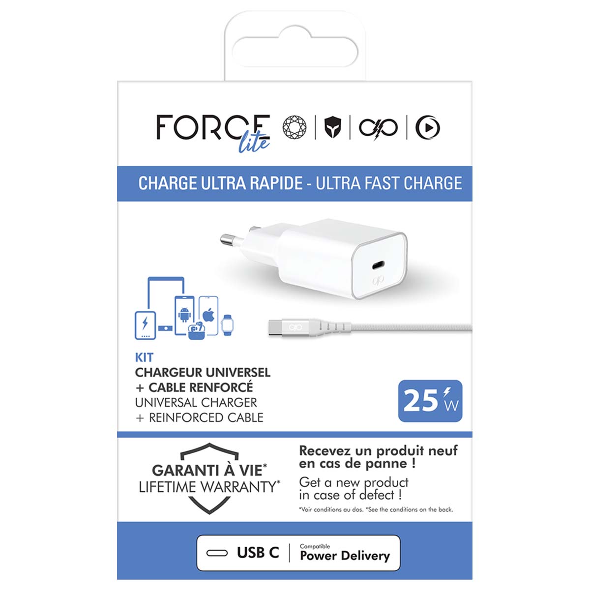 Tämä latauspakkaus sisältää 25 W:n sisäisen laturin ja vahvistetun USB-C/USB-C-kaapelin. Power Delivery -tekniikan ansiosta se lataa älypuhelimesi nopeasti ja turvallisesti.
