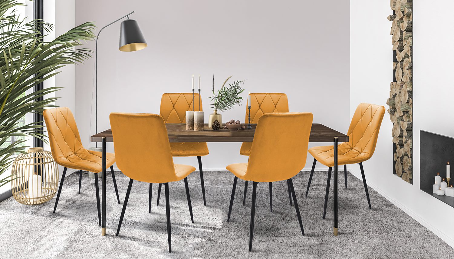 Tuoli on verhoiltu samettilla ja tikattu sisäpuolelta tavallisilla timanttitikkaustikkausilla. Korkeat ja hoikat mustat jalat näyttävät erittäin tyylikkäiltä ja takaavat täydellisen vakauden. Väri: hunaja/sinappi