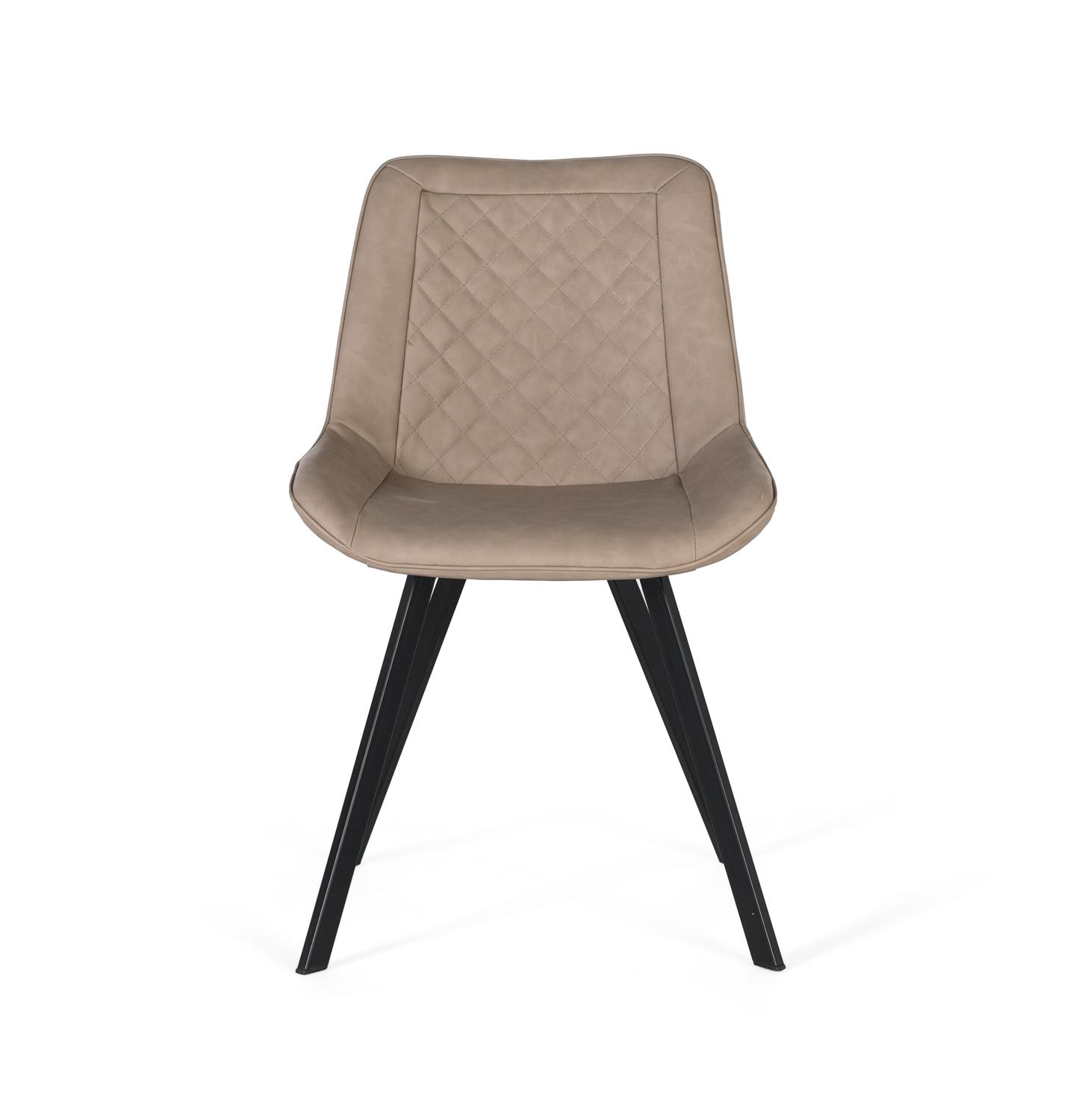 Setti koostuu kahdesta elegantista tuolista, jotka on verhoiltu beigenvärisellä PU-nahalla. Verhoilu on kauttaaltaan pehmustettu, mikä tarjoaa mukavan ja pehmeän istumistuntuman. Tuolien selkänojat on koristeltu monimutkaisilla tikkauksilla, jotka muodostavat pieniä timantteja ja lisäävät settiin käsintehtyä silausta. Tuolin jalat on valmistettu neliönmuotoisesta teräsputkesta, ja niiden mattamusta viimeistely on hienovaraisesti kontrastissa verhoilun pehmeän sävyn kanssa.