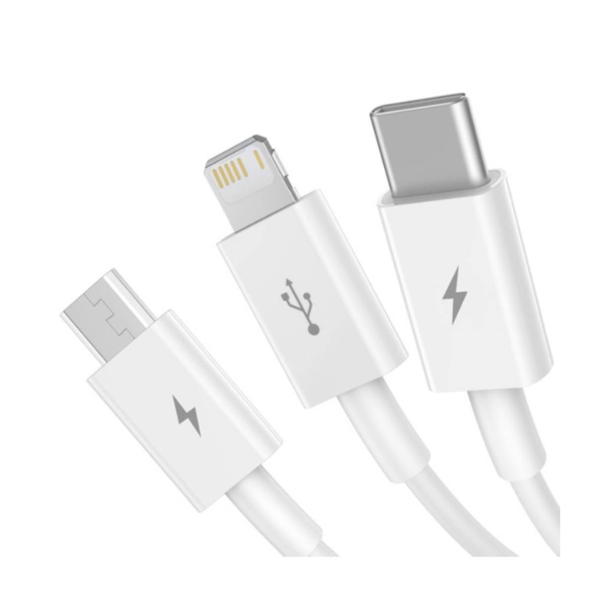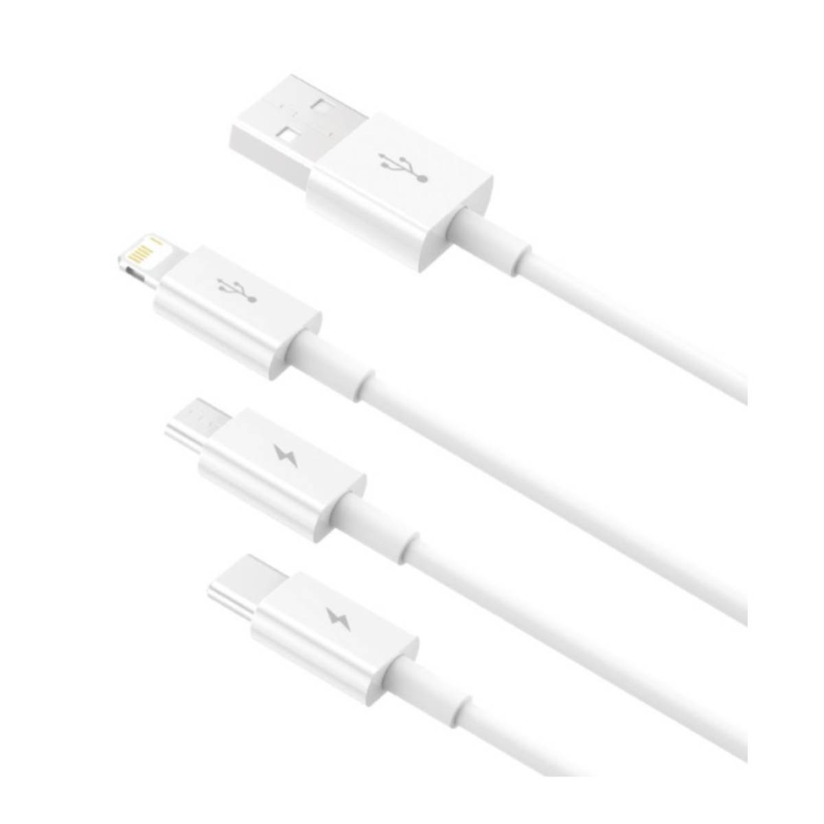 Tämän erittäin nopean 3-in-1-kaapelin avulla akku ei enää koskaan lopu kesken, sillä se tarjoaa optimaalisen ja tehokkaan latauksen laitteillesi. Kolmen monipuolisen liittimen ansiosta voit ladata jopa kolme laitetta samanaikaisesti ennätysajassa. Lightning-liittimen ansiosta voit myös synkronoida tietoja sujuvasti ja erittäin nopeasti, mikä takaa tiedostojesi turvallisen siirron. 3,5A lataus- ja datasynkronointikaapeli. Varmistaa laitteiden nopean latauksen ennätysajassa. Siirrä tiedostoja jopa 480 Mbps:n nopeudella Lightning-liitännän avulla. Suojaa laitetta ylikuormitukselta ja ylikuumenemiselta sovittamalla virran laitteeseen sopivaksi. 3-in-1-kaapeli, joka tukee laitteita, joissa on USB-C-, Lightning- ja MicroUSB-liitäntä.