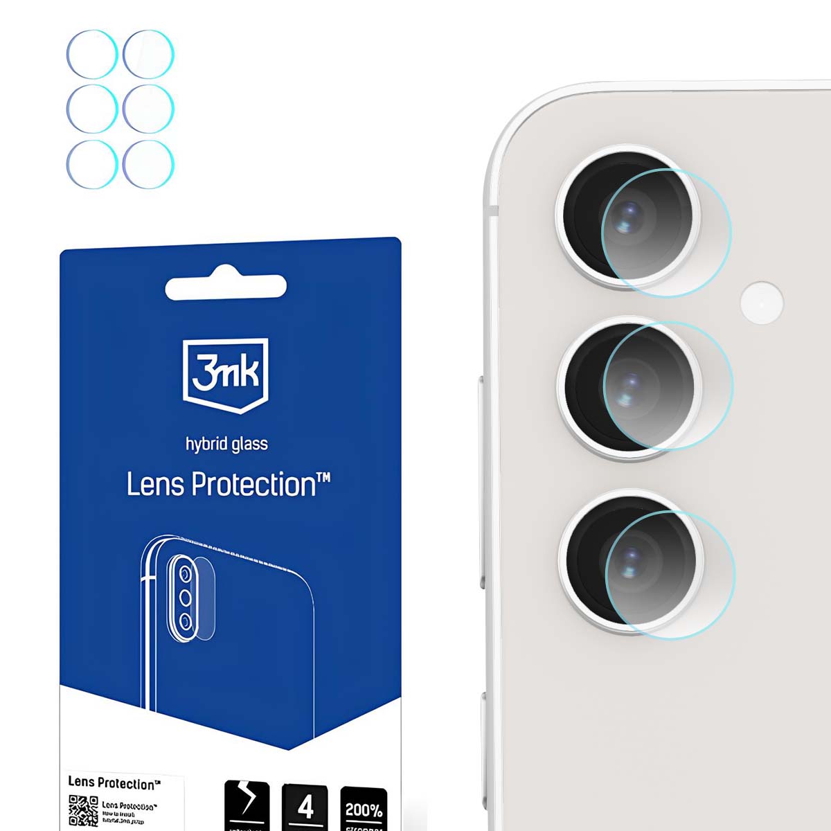 Tämä pakkaus sisältää 4 sarjaa 3MK-linssisuojia Galaxy S23 FE -puhelimelle, 3 kappaletta per sarja. Jokainen suoja peittää linssin tarkasti häiritsemättä salamaa tai muuttamatta kuvanlaatua. Keraamisella pinnoitteella vahvistettu hybridilasi on luokiteltu 6H-luokkaan ja suojaa naarmuilta ja mikroiskuilta. Iskun sattuessa lasi jakaa rasitusta vähentäen halkeamisriskiä jopa 200 %.