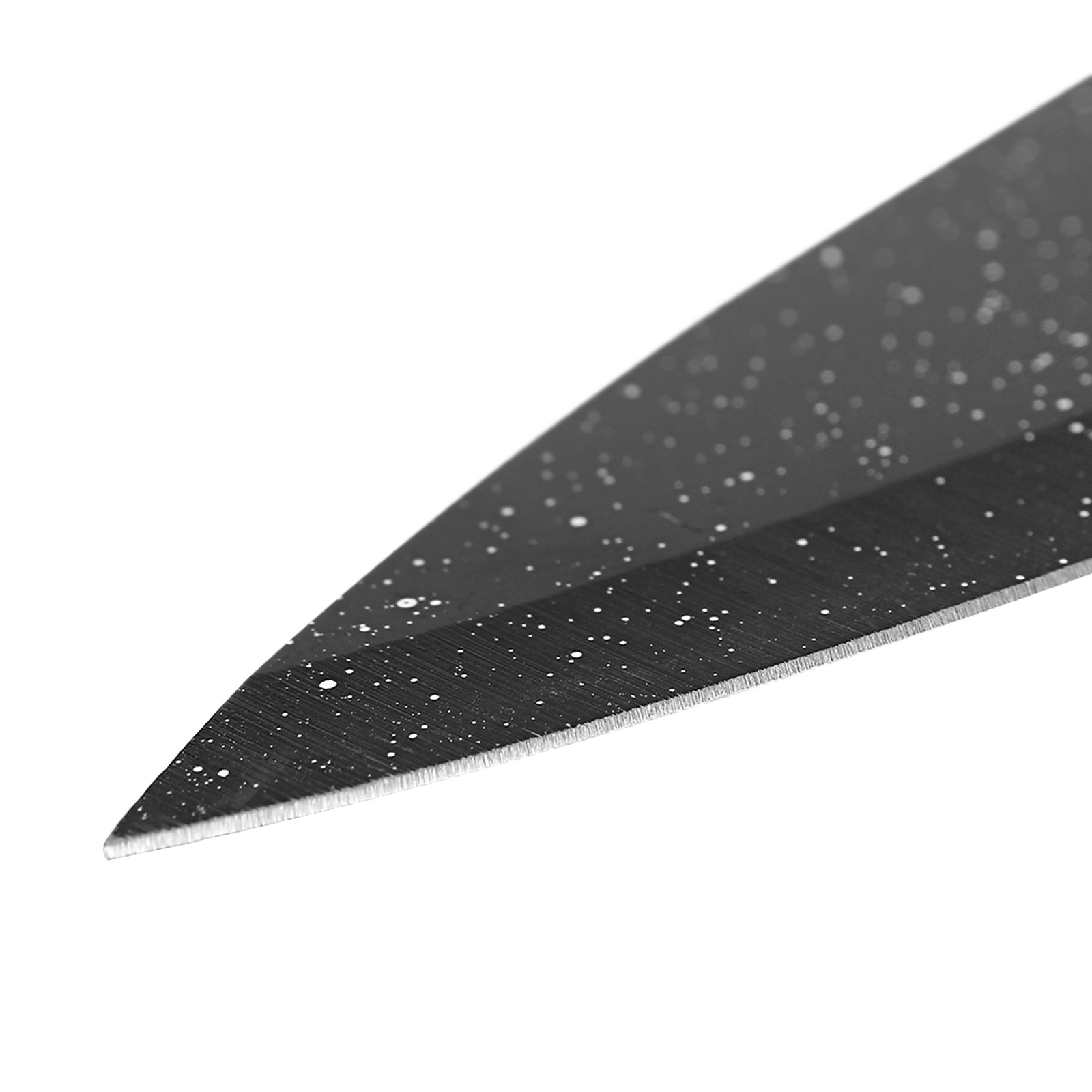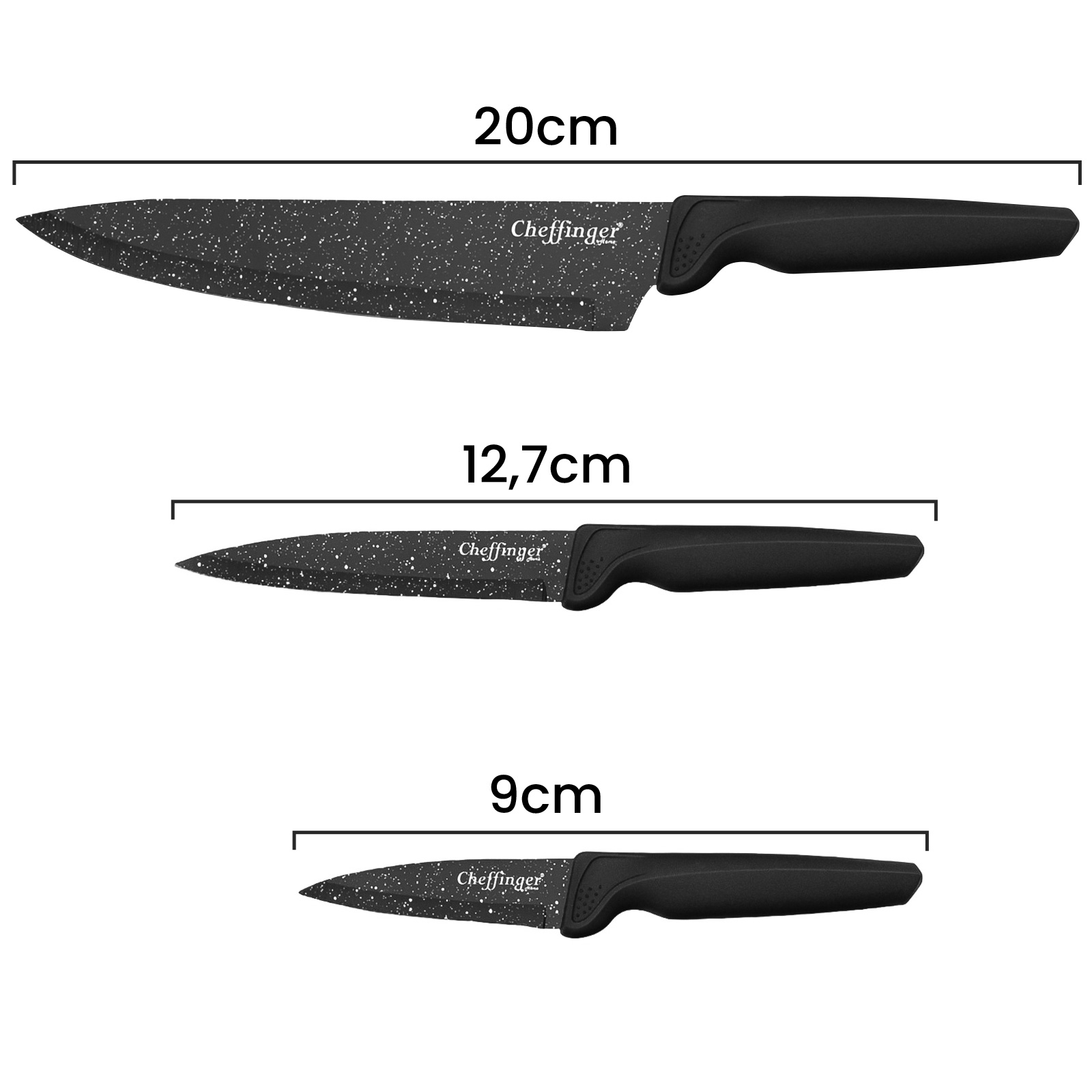 Hemmottele itseäsi tyylikkäästi suunnitellun keittiöveitsisarjan tarkkuudella ja tehokkuudella. Tämä ChefFinger-sarja sisältää kolme mustalla pilkullisella ruostumattomasta teräksestä valmistettua veitseä, joissa on tarttumaton pinnoite puhdasta leikkausta ja helppoa huoltoa varten. Ergonomiset kahvat takaavat mukavan ja turvallisen otteen. Settiin sisältyvä teroitin auttaa säilyttämään optimaalisen leikkausreunan, joten voit kokata kuin kokki päivästä toiseen.