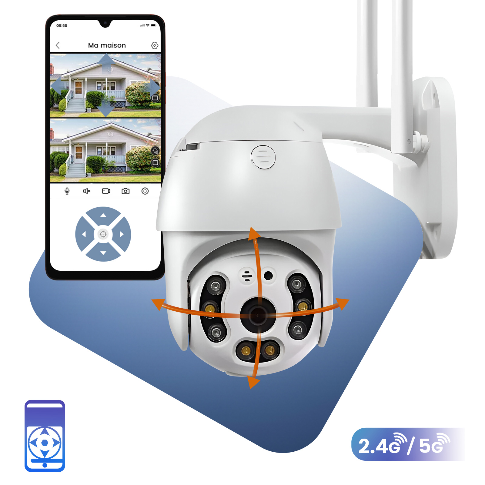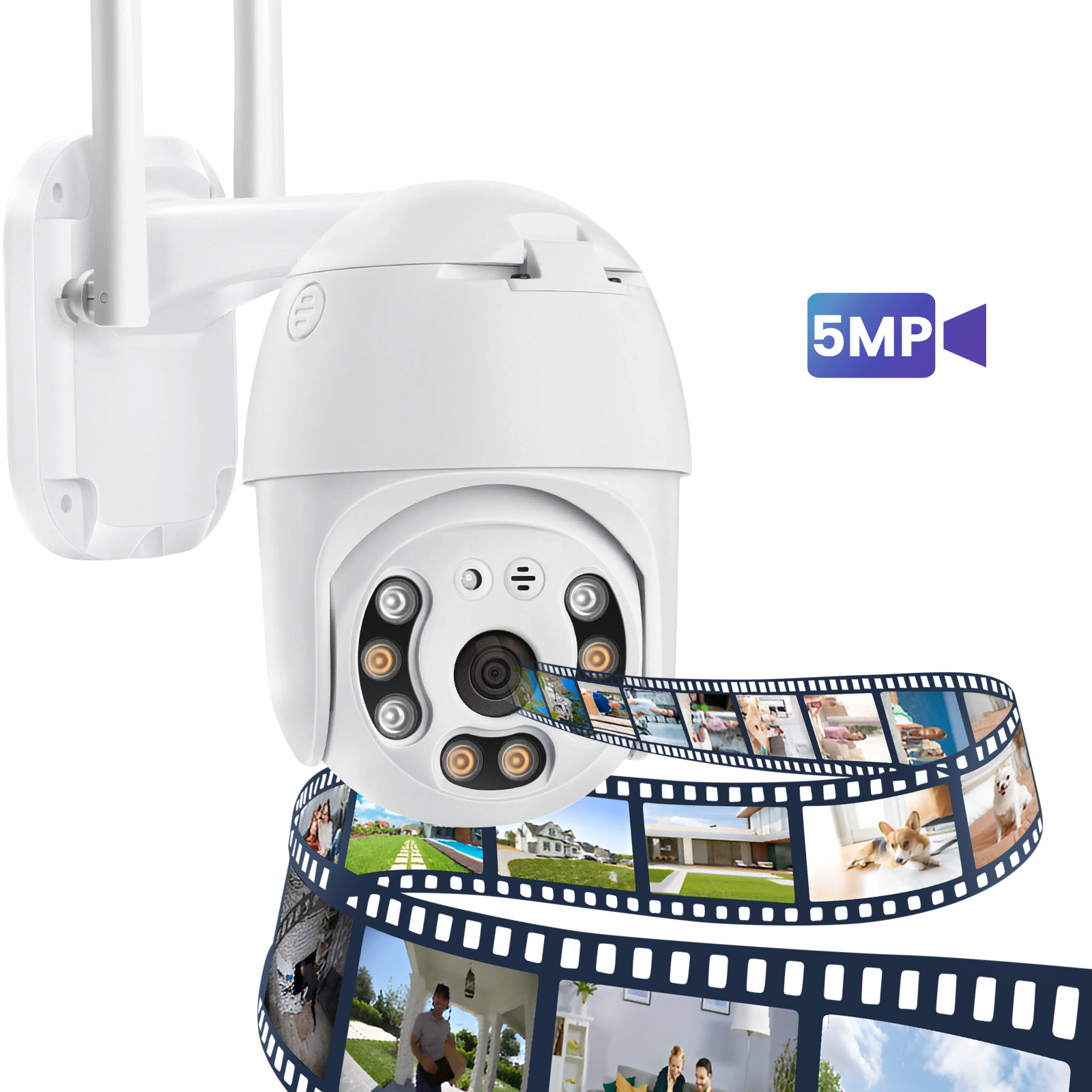 Tämä 5 megapikselin Wi-Fi-kamera tarjoaa luotettavaa ulkotilojen valvontaa moottoroidun pyörivän pään ja värillisten LED-yökuvien ansiosta. Se on yhdistetty 2,4G:n / 5G:n kautta, ja se tarjoaa tarkan kuvan, digitaalisen zoomin ja kaksisuuntaisen äänen etäkommunikaatiota varten. Reaaliaikaiset liikehälytykset parantavat kotisi turvallisuutta. Yksinkertainen asennus, ihanteellinen puutarhaan, pihatielle tai autotalliin.