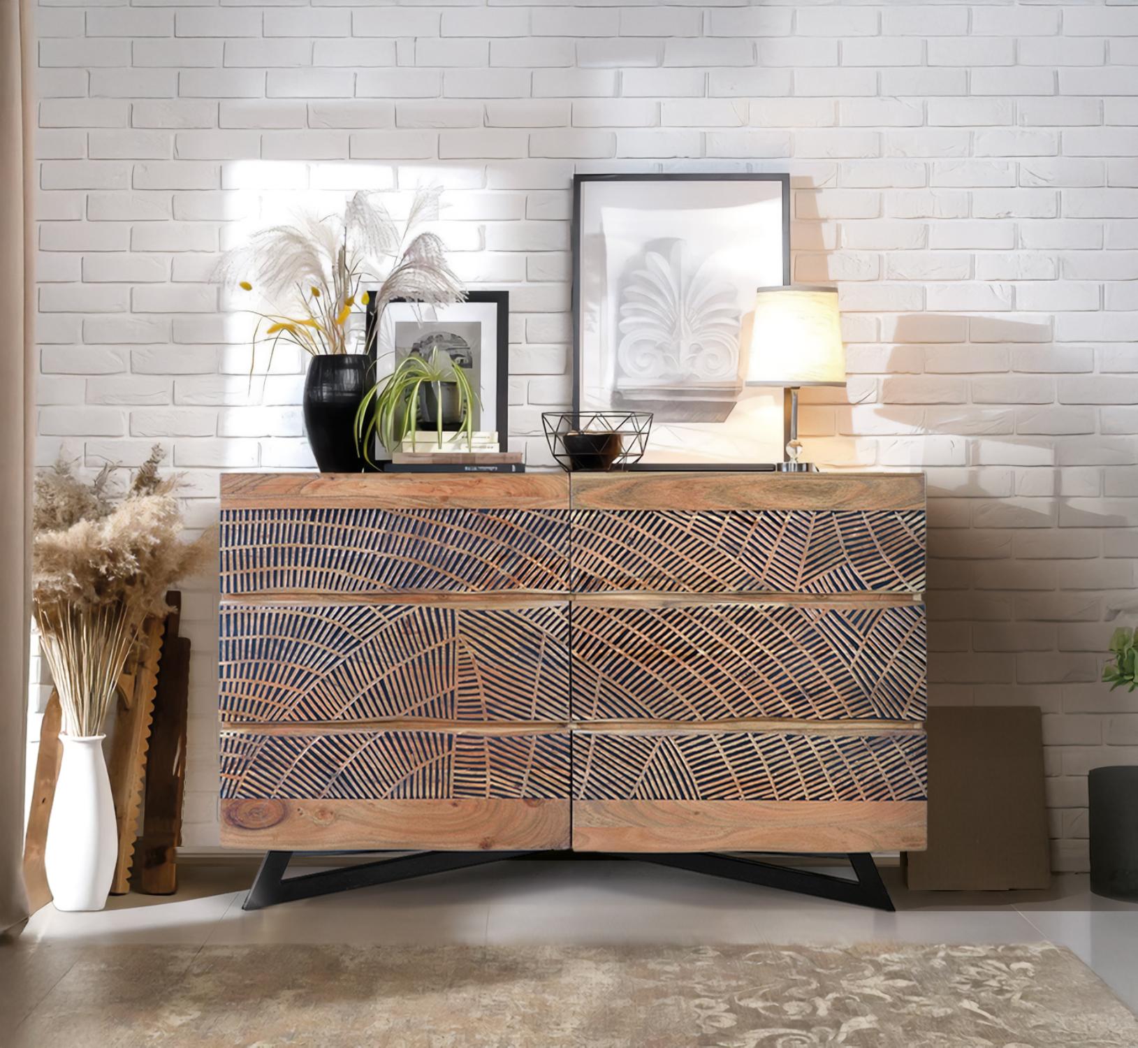 Kuusilaatikkoinen lipasto akaasiapuuta, metallijalat, luonnollinen viimeistely. Laatikoiden eturivit on koristeltu käsin veistetyillä veistoksilla. Lipaston mitat ovat 86 cm korkea, 125 cm leveä ja 40 cm syvä, paino 85 kg. Pakkauksen mitat ovat 92 x 132 x 47 cm. Koska kyseessä on käsintehty luonnonpuusta valmistettu kappale, siinä saattaa säilyä alkuperäiset oksankohdat ja syykuviot, ja siksi siinä voi olla pieniä värivaihteluita.