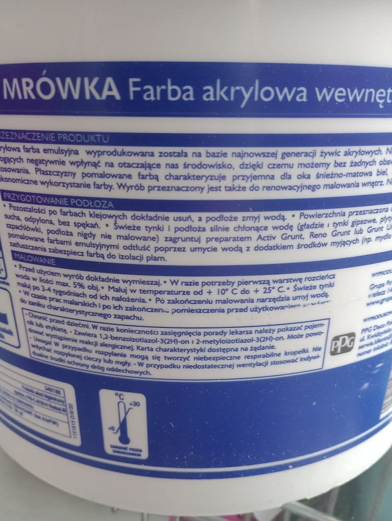 Sillä maalatut elementit on koristeltu silmiä miellyttävillä, lumisilla, mutta mattaväreillä. Tuotteella on erittäin korkea peittokyky, mikä tekee siitä taloudellisen.AkryylimaaliMRÓWKA soveltuu myös erilaisten sisätilojen kunnostamiseen. Sitä ei kuitenkaan tule käyttää pohjamaalina.