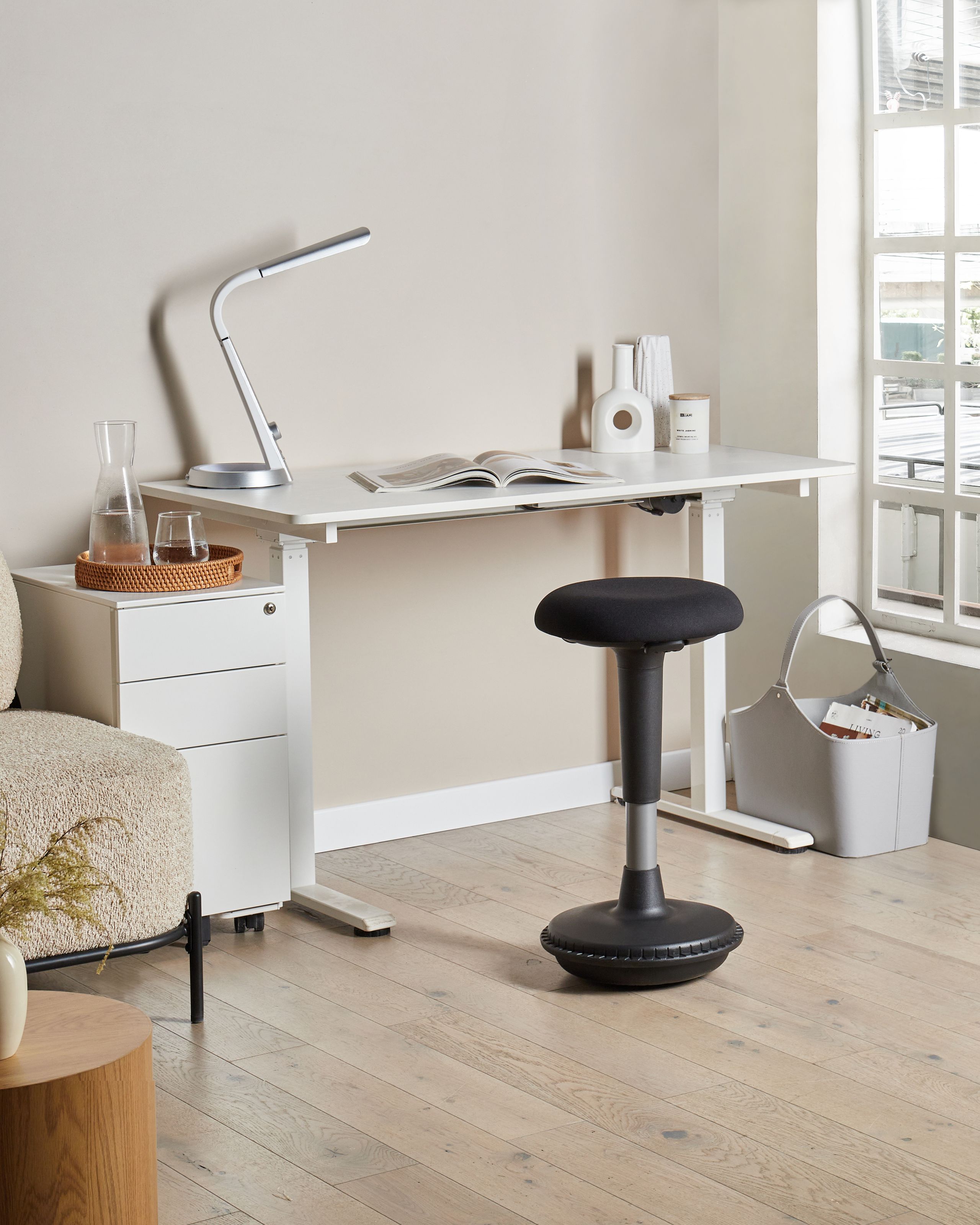 Ergonominen aktiivituoli kangasistuimella. Tämä moderni aktiivituoli on suunniteltu edistämään aktiivista istumista ja parantamaan ryhtiä koko päivän ajan. Säädettävä korkeus mahdollistaa helpon mukauttamisen erilaisten työpöytien korkeuksiin, mikä tekee tuolista erinomaisen sekä istuma- että seisoma-asentoihin. Istuin on verhoiltu laadukkaalla polyesterikankaalla, joka on mukavaa, kestävää ja helppohoitoista. Tukeva teräsrunko takaa pitkäikäisen vakauden ja edistää samalla keskivartalon lihasten käyttöä ja joustavuutta.