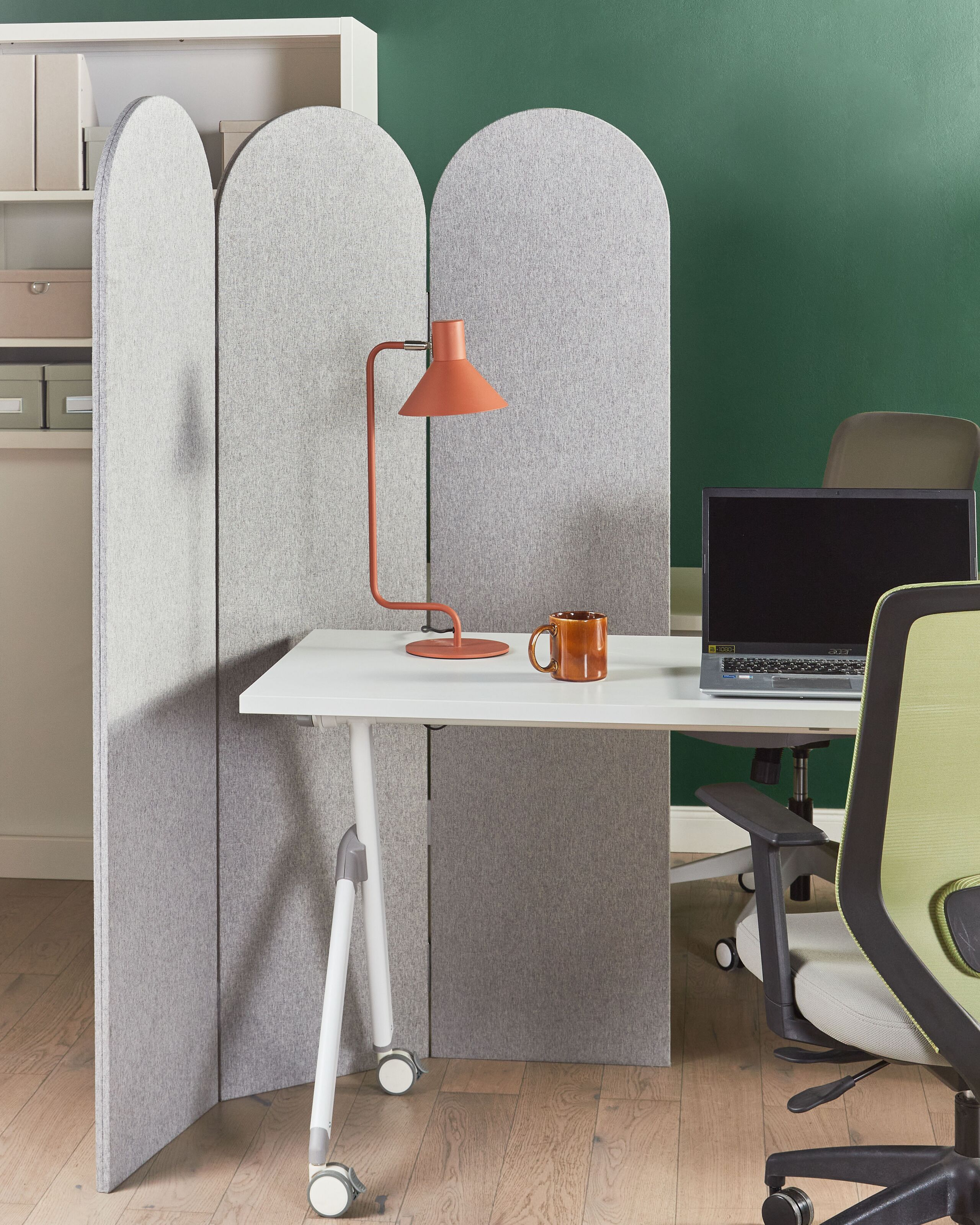 Kokoontaitettava akustinen sermi. Luo rauhallinen ja tyylikäs ilmapiiri kotiisi tai toimistoosi tällä 3-panelisella tilanjakajalla. Ympäristöystävällisestä PET-materiaalista valmistetuissa paneeleissa on pehmeä polyesteriverhoilu, jonka universaali väri ja paneelien pyöristetyt päät lisäävät modernia tyylikkyyttä. Monikäyttöinen akustinen sermi sopii erinomaisesti yksityisen työalueen luomiseen ja keskittymisen edistämiseen avoimissa tiloissa. Sen minimalistinen ilme ja upea muotoilu tuovat ympäristöön ripauksen hienostuneisuutta, käytettiinpä sitä sitten toiminnallisesti tai pelkkänä koristeena.