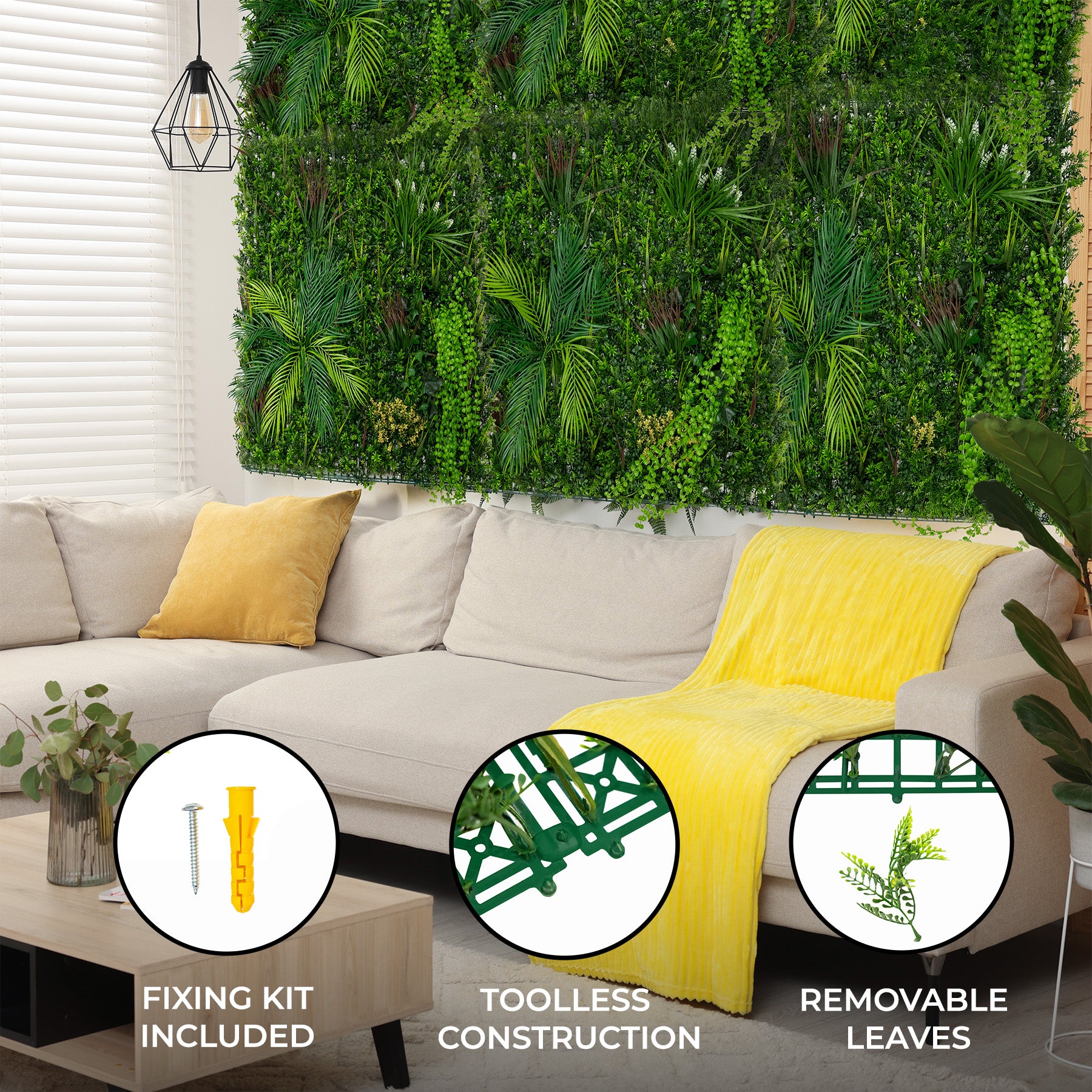 Nämä 100 cm x 100 cm:n kokoiset laatat tarjoavat laajan peittoalan, jonka avulla voit vaivattomasti luoda realistisen kasviseinän ilmeen. Vaikuttavaksi ja käytännölliseksi suunnitellut laatat takaavat saumattoman istuvuuden, olitpa sitten korostamassa pientä tehostealuetta tai peittämässä koko pinnan eloisalla vihreydellä.