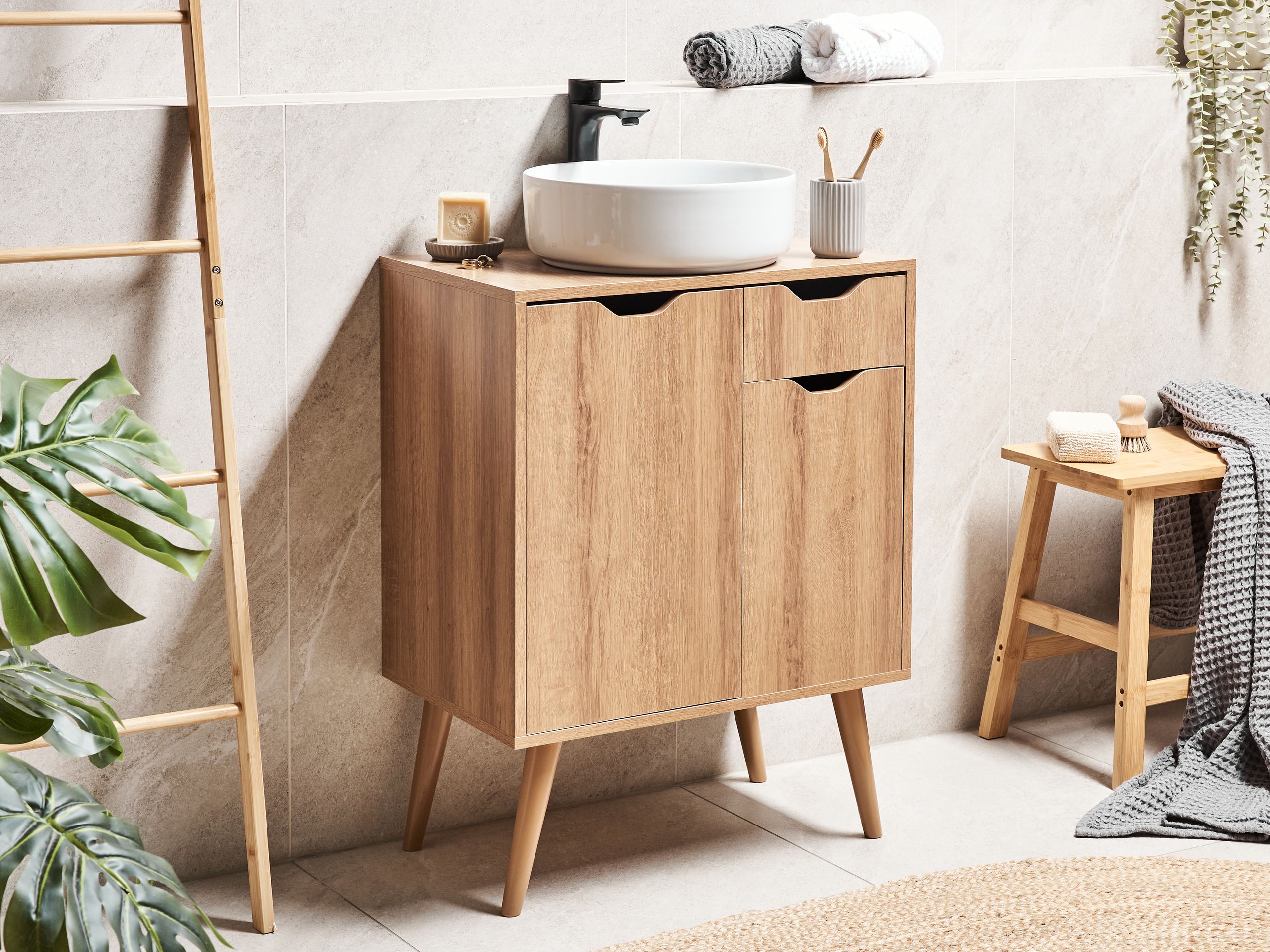 Kylpyhuoneen pesuallaskaappi laatikolla. Tämä tyylikäs allaskaappi yhdistää käytännöllisyyden ja tyylin, sillä siinä on kätevä laatikko ja kaksi ovien taakse piilotettua hyllyä. Kestävästä keskitiheästä lastulevystä (MDP) valmistettu kaappi on helppohoitoinen ja tarjoaa runsaasti säilytystilaa kylpyhuoneen välttämättömille tarvikkeille. Vaalean sävynsä ansiosta se sulautuu vaivattomasti useisiin sisustuksiin ja sopii myös pienempiin tiloihin kompaktin kokonsa vuoksi.