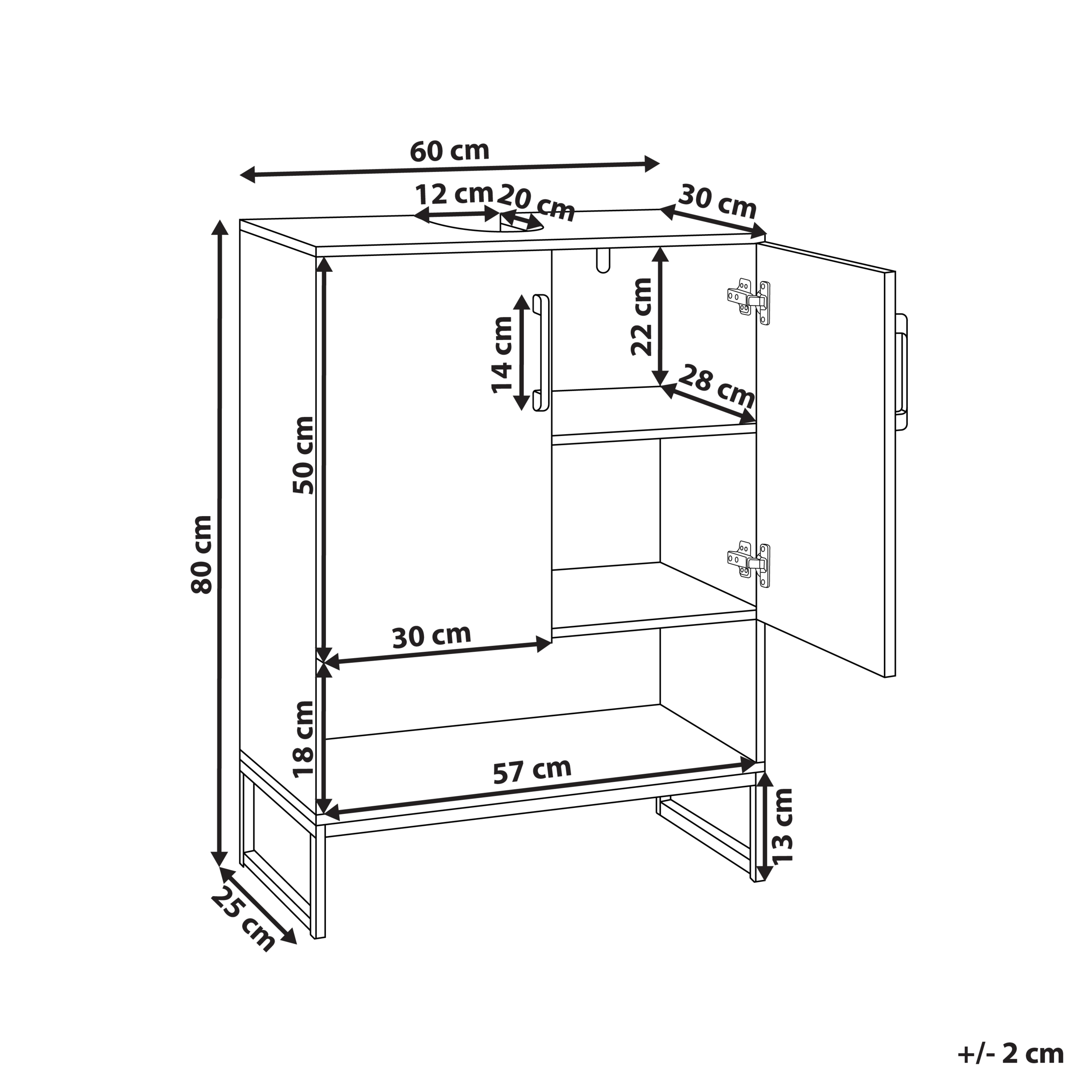 Moderni kylpyhuoneen allaskaappi hyllyillä. Tämä allaskaappi on suunniteltu maksimoinaan käytettävissä oleva tila. Siinä on kaksi magneettilukolla toimivaa ovea, joiden taakse kätkeytyvät kaksi hyllyä tarjoavat runsaasti tilaa kaikille välttämättömille kylpyhuoneen tarvikkeille. Alapuolella oleva lisähylly lisää kaapin käytännöllisyyttä ja helpottaa tarvikkeiden saatavuutta. Kaapin etuosat on valmistettu bambusta ja runko tukevasta MDF-levystä ja teräksestä, mikä tekee siitä sekä kestävän että vakaan. Modernilla viimeistelyllään se on käytännöllinen ja tyylikäs lisä mihin tahansa kylpyhuoneeseen.