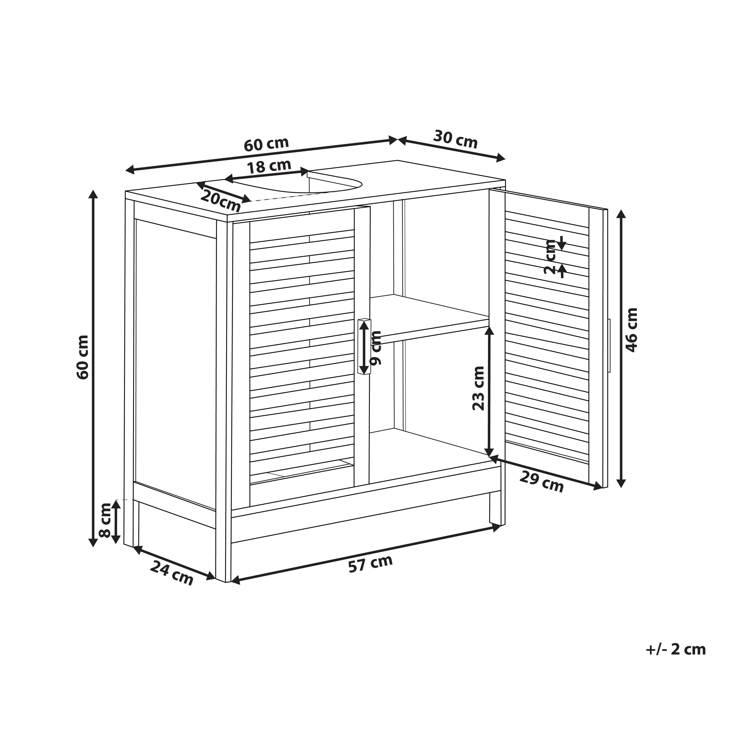 Minimalistinen pesuallaskaappi säleovilla. Kauniista bambusta valmistettu allaskaappi yhdistää tyylin ja käytännöllisyyden. Ympäristöystävällinen ja elegantti kaappi tuo modernia sekä lämminhenkistä tunnelmaa jokaiseen kylpyhuoneeseen. Tilavat hyllyt säleovilla tarjoavat runsaasti säilytystilaa kosmetiikalle ja muille tärkeille tarvikkeille. Hienostunut muotoilu ja käytännöllisyys auttavat luomaan siistin ja järjestelmällisen ympäristön, jossa kaikki tarvittava on käden ulottuvilla. Tämä pesuallaskaappi on erinomainen valinta kauniita ja toimivia ratkaisuja arvostaville.