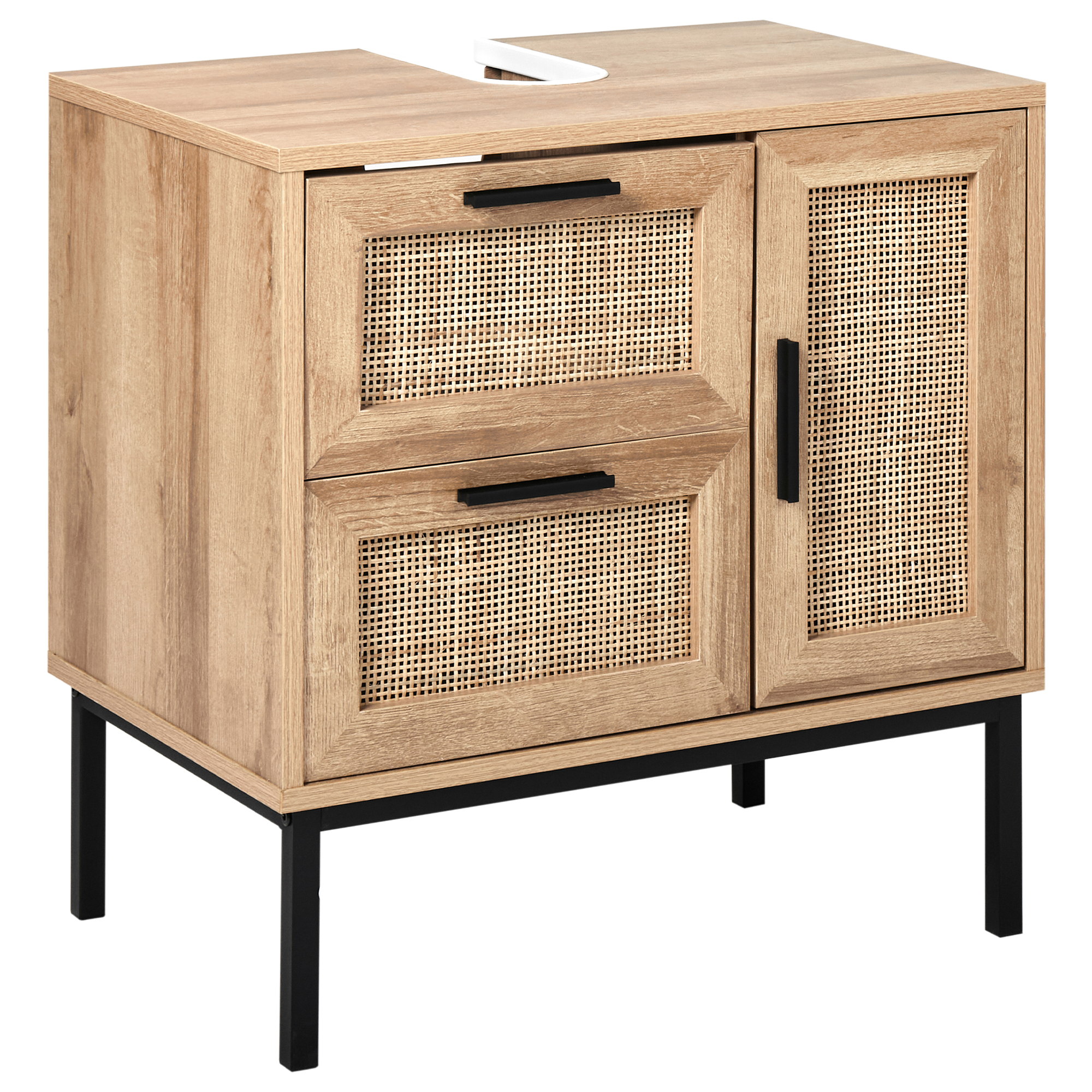 Rustiikkinen allaskaappi rottinkiverkolla. Lisää luonnollista viehätystä kylpyhuoneeseesi tällä tyylikkäällä allaskaapilla. Kestävästä lastulevystä valmistetussa kaapissa on rottinkipunotut ovet ja laatikko, jotka tuovat siihen lämpöä ja tekstuuria. Kaapissa on kaksi kaappia sekä säilytyslaatikko, jotka tarjoavat runsaasti tilaa kosmetiikkatuotteille ja muille kylpyhuoneen välttämättömille tarvikkeille. Se sopii täydellisesti pitämään kylpyhuoneen järjestyksessä ja rikastuttaa tilaa ripauksella rustiikkista eleganssia.