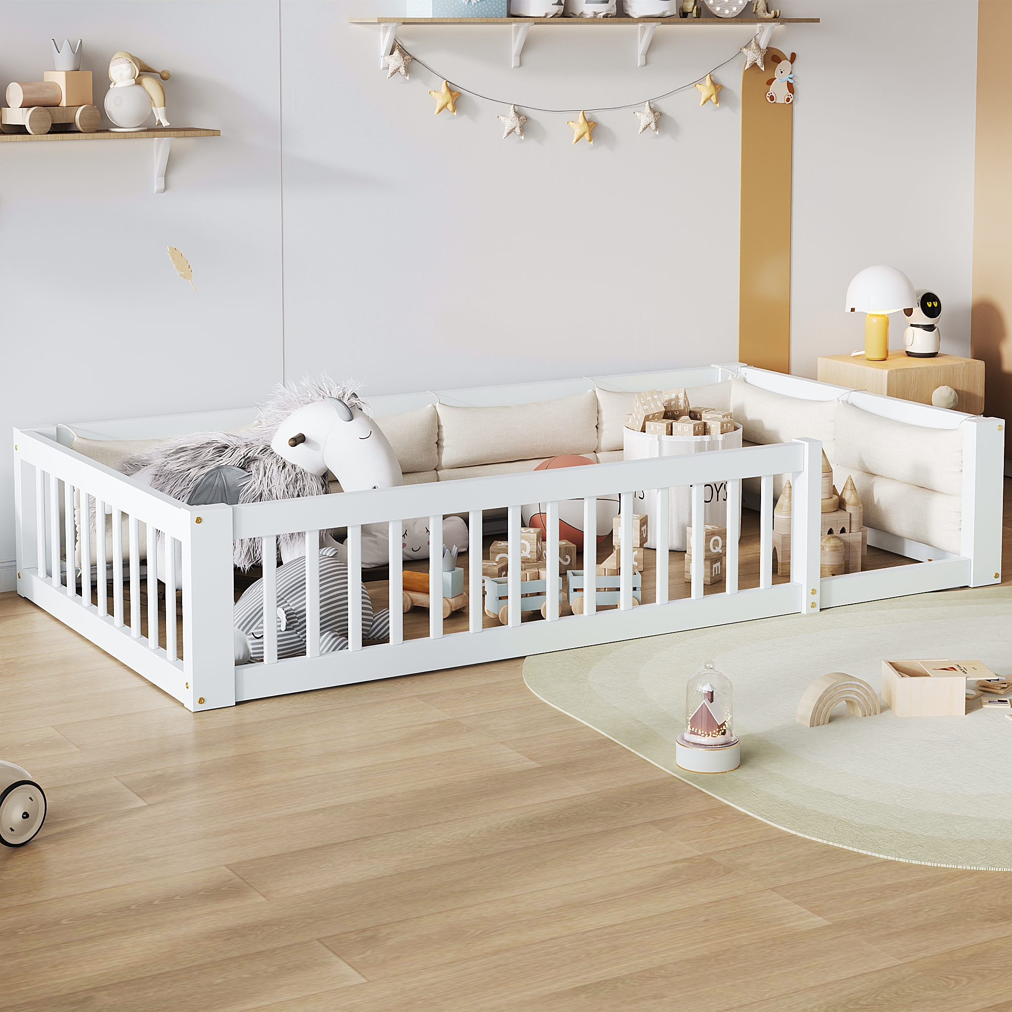 [Turvallisuus taattu] Sängyn täyspitkät suojalaiteet estävät putoamisen. Nauti monien vuosien rentoutumisesta ja perheen hauskanpidosta tässä huolellisesti suunnitellussa puusängyssä.