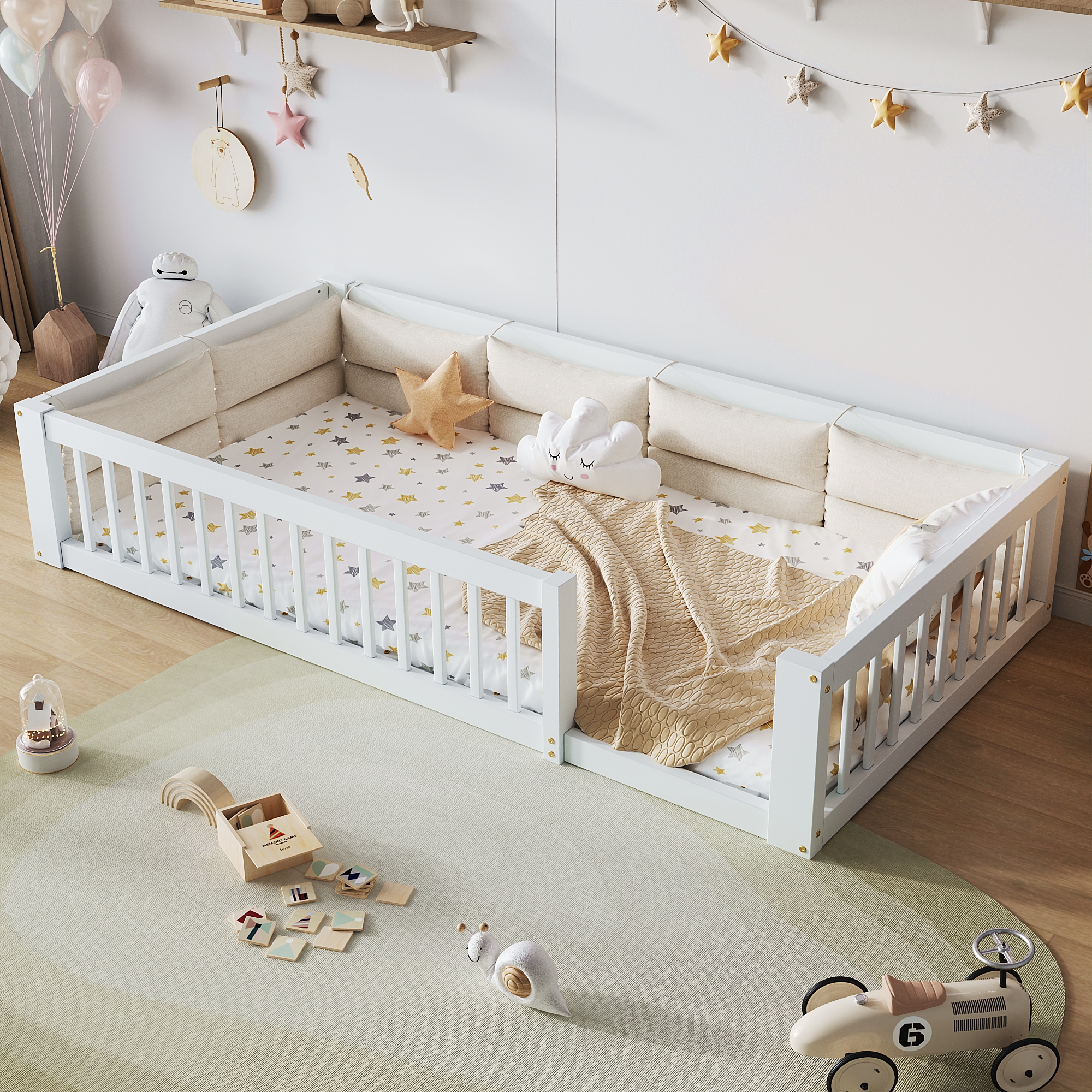 [Mukavat tyynyt] Sängyn päädyssä ja sivuilla on pehmeät tyynyt. Sinun tarvitsee vain kiinnittää tyynyt sängyn laitaan. Niin mukavaa lukea tai katsella televisiota!