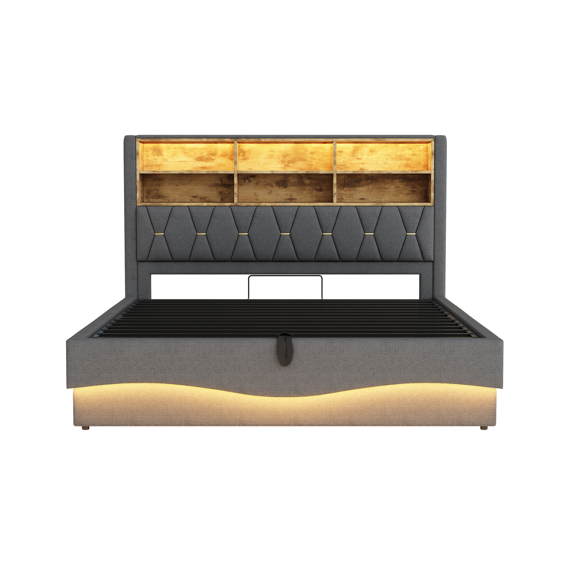 Älykäs verhoiltu sänky, 180x200cm, App LED, hydraulinen säilytystila harmaalla pellavalla