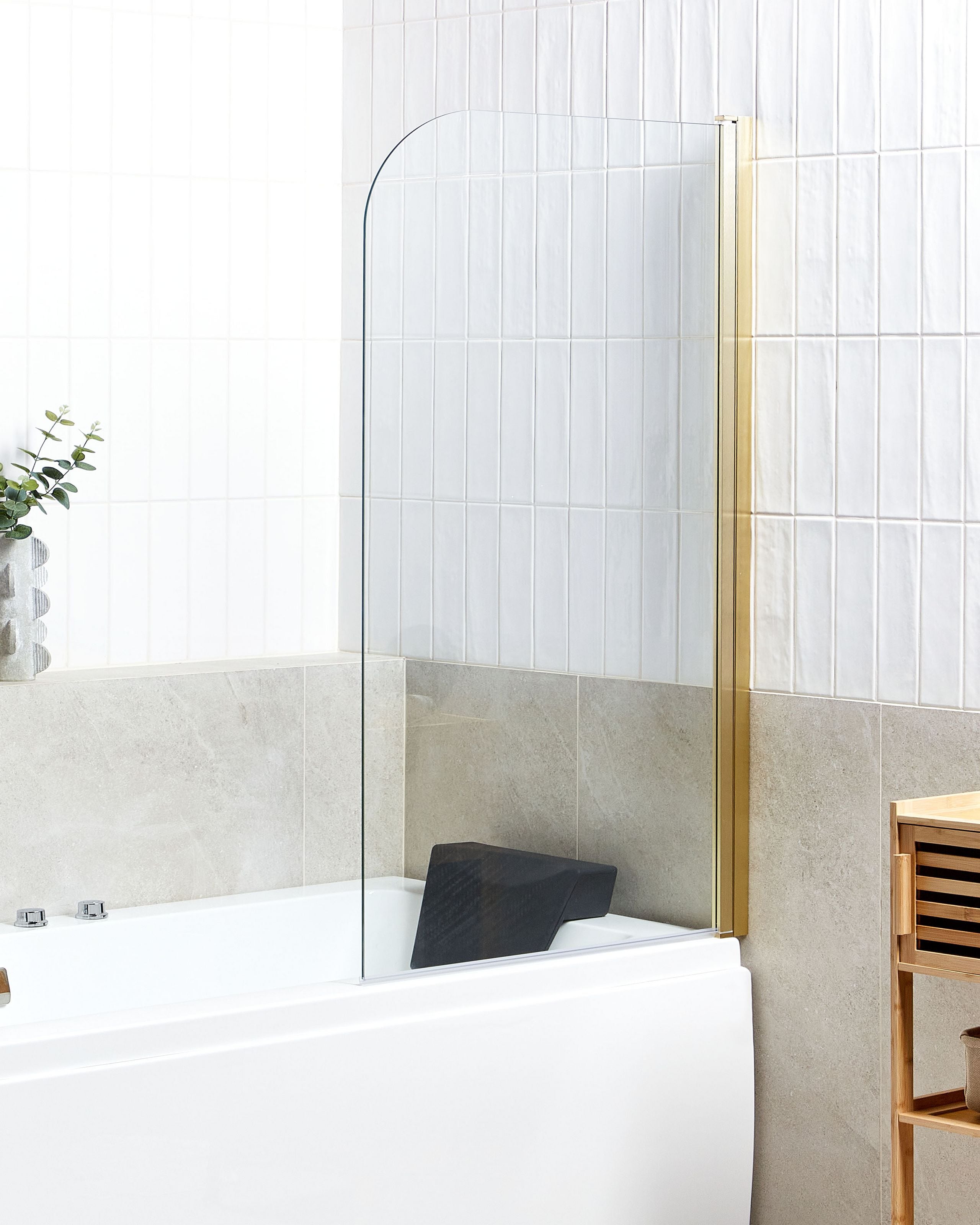 Minimalistinen kääntyvä lasiseinä ammeeseen. Lisää kylpyhuoneeseesi yksityisyyttä ja estä veden roiskuminen suihkua käyttäessäsi tällä kätevällä ammeseinällä. Paneeli on hieman säädettävissä, joten voit suojata kylpyhuonetta tehokkaammin, ja siinä on tiiviste, joka tarjoaa lisäsuojaa pintaa pitkin valuvilta pisaroilta. Paneeli on valmistettu kestävästä, lämmönkestävästä karkaistusta lasista, ja seinään asennettava klassinen kullanvärinen reunus on alumiinia. Yksinkertaisen muotonsa ansiosta se näyttää upealta kaikissa moderneissa, minimalistisissa, glamour-tyylisissä ja perinteisissä sisustuksissa.