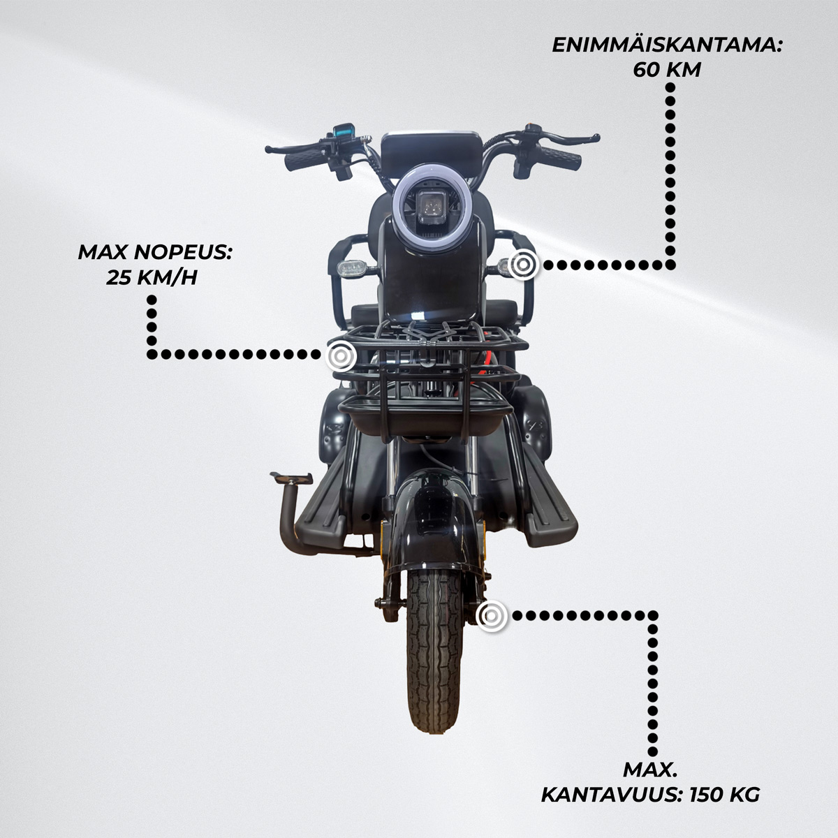 Enimmäiskantama: jopa 60 km (vaihtelee kuljettajan painon, maaston ja sääolosuhteiden mukaan)