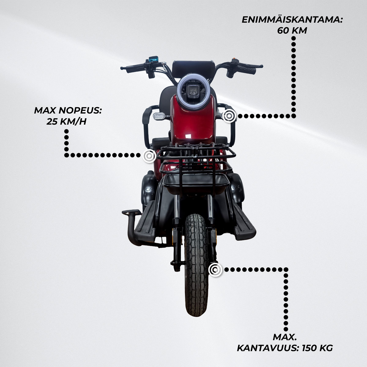 <p>P250 Punainen on suunniteltu tuomaan arkeen vapautta ja sujuvuutta: hallittava nopeus, mukava jousitus ja luotettava jarrutus tekevät ajamisesta varmaa. Tehokas 60 V 20 Ah akku vähentää lataustarvetta ja antaa mahdollisuuden pidempiin matkoihin ilman jatkuvaa suunnittelua.</p>