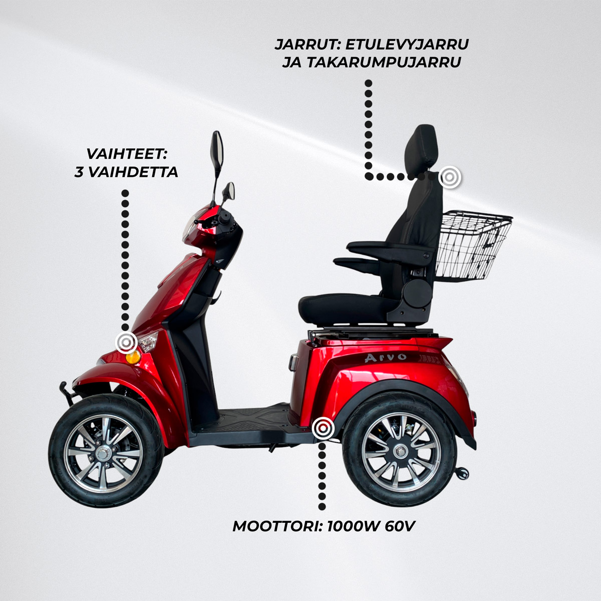 <p>Löydä vapaus ja itsenäisyys uudella Arvo Senioriskootteri P800 Punaisella, joka yhdistää tyylikkyyden ja huippuluokan teknologian. Tämä senioriskootteri on suunniteltu erityisesti mukavuutta ja helppokäyttöisyyttä silmällä pitäen, tarjoten käyttäjilleen turvallisen ja nautinnollisen ajokokemuksen. Sen voimakas 1000W moottori ja huippunopeus 25 km/h takaavat, että pääset määränpäähäsi nopeasti ja tehokkaasti, kun taas pitkä toimintasäde 45 km varmistaa, ettei matka katkea kesken. Hydrauliset iskunvaimentimet ja järeät jarrut takaavat sujuvan menon kaikissa maastoissa ja sääolosuhteissa.</p><p>Huom. Kevyen sähköajoneuvon kuljettajan on oltava 15-vuotta täyttänyt.</p>