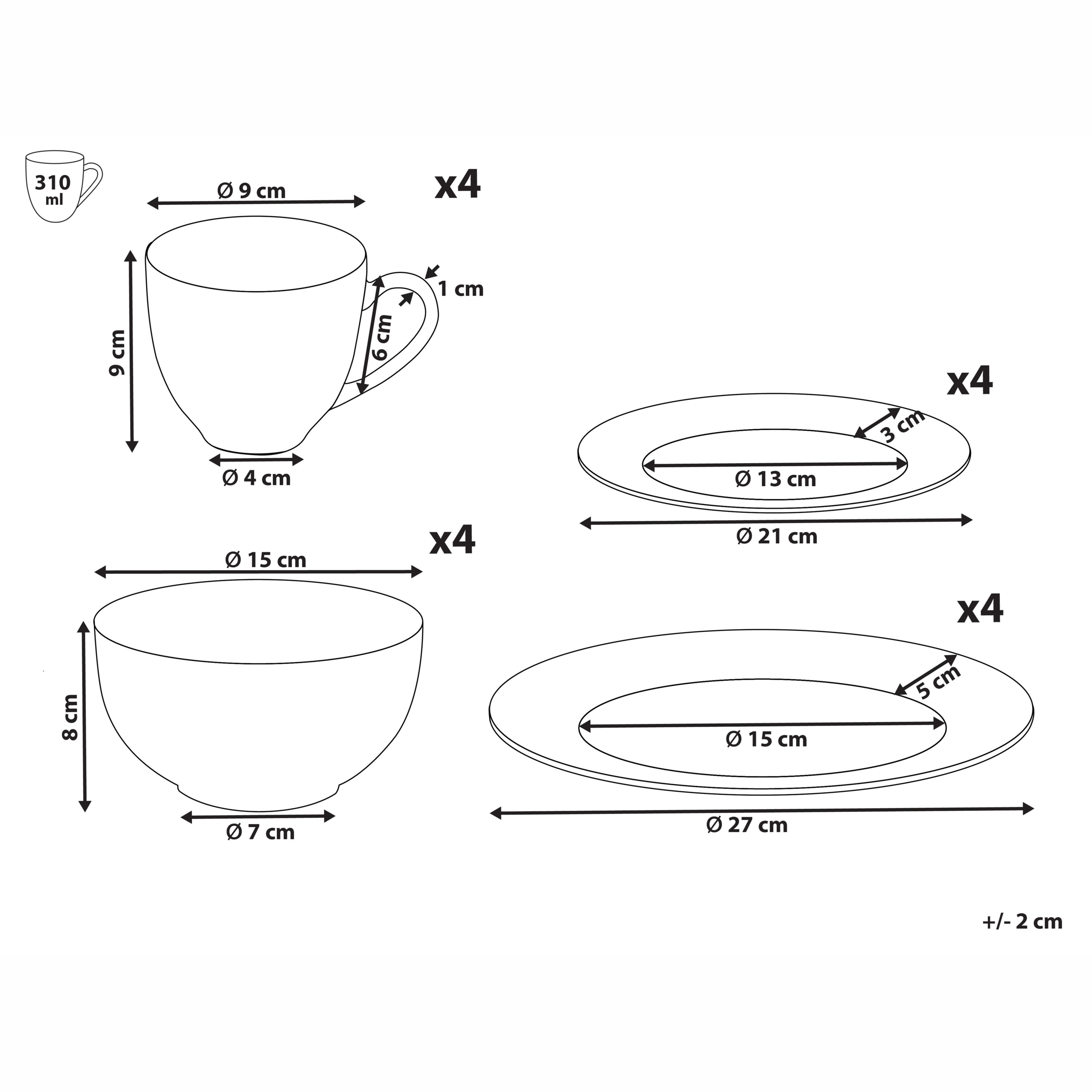 Hintaan sisältyy: 4 x Ruokalautanen, 4 x Sivulautanen, 4 x Kulho, 4 x Muki