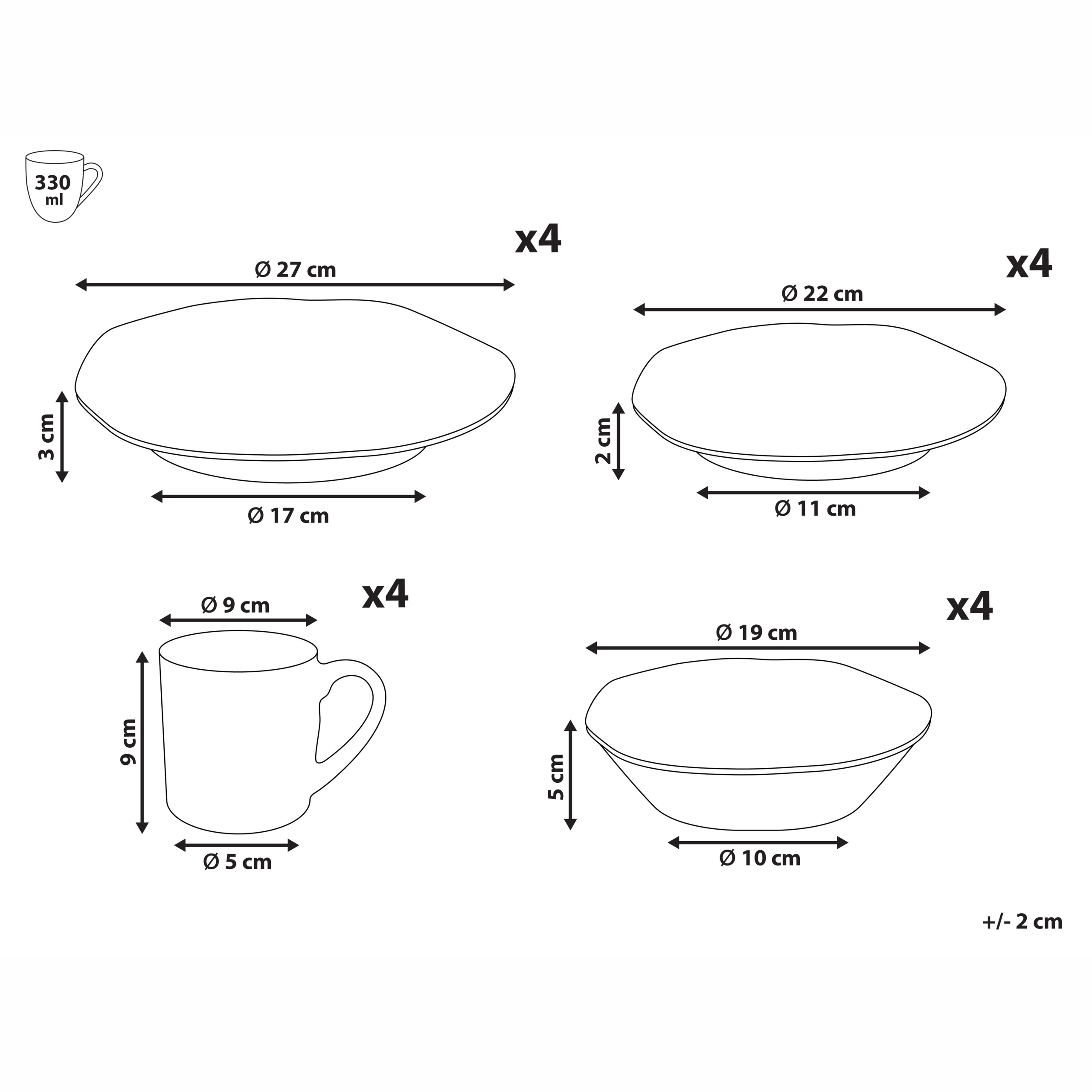Hintaan sisältyy: 4 x Ruokalautanen, 4 x Sivulautanen, 4 x Muki, 4 x Syvä lautanen