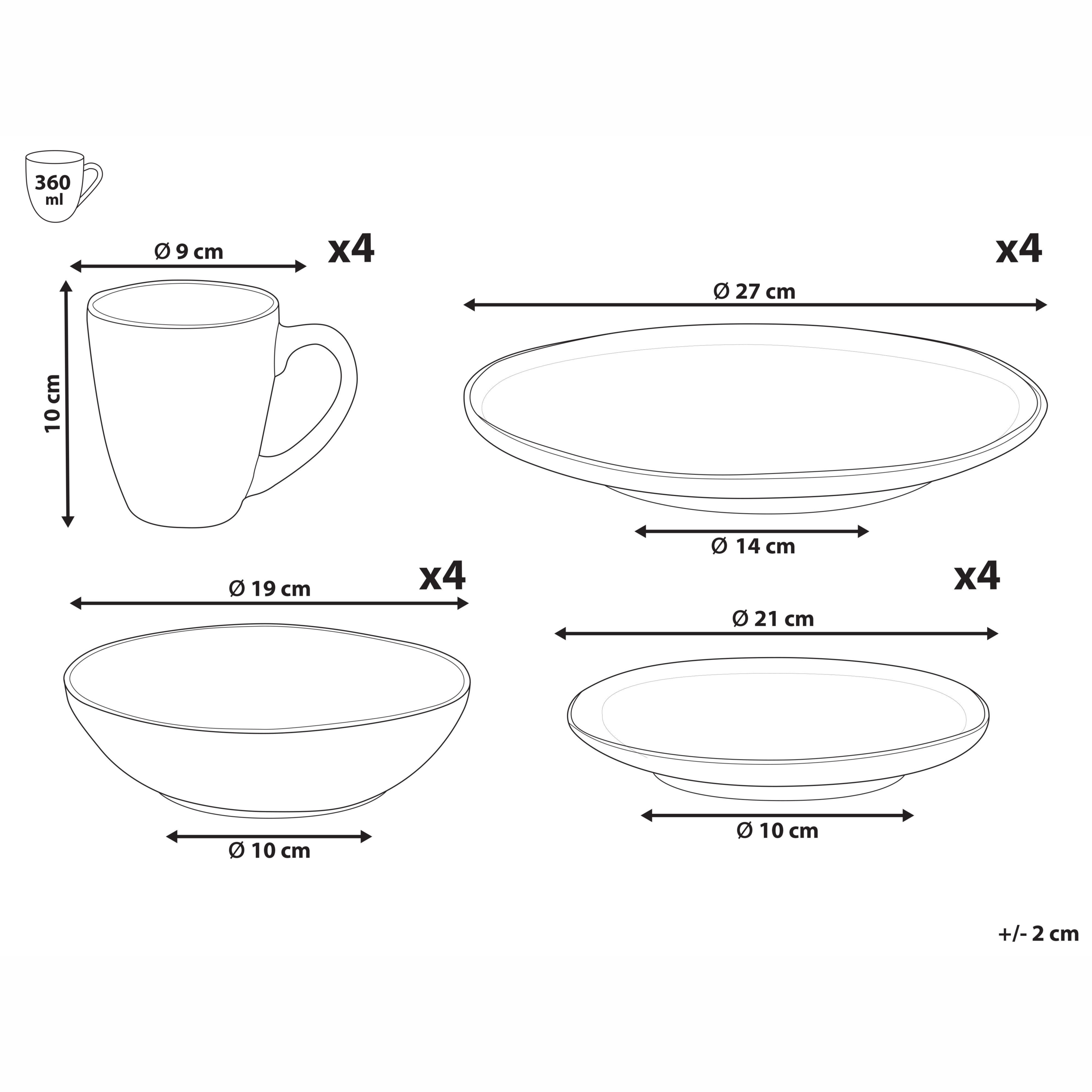 Hintaan sisältyy: 4 x Ruokalautanen, 4 x Sivulautanen, 4 x Muki, 4 x Syvä lautanen