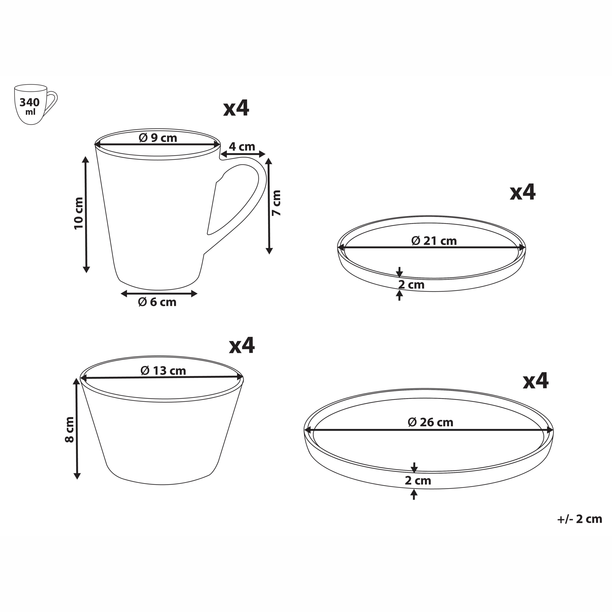 Hintaan sisältyy: 4 x Ruokalautanen, 4 x Sivulautanen, 4 x Kulho, 4 x Muki