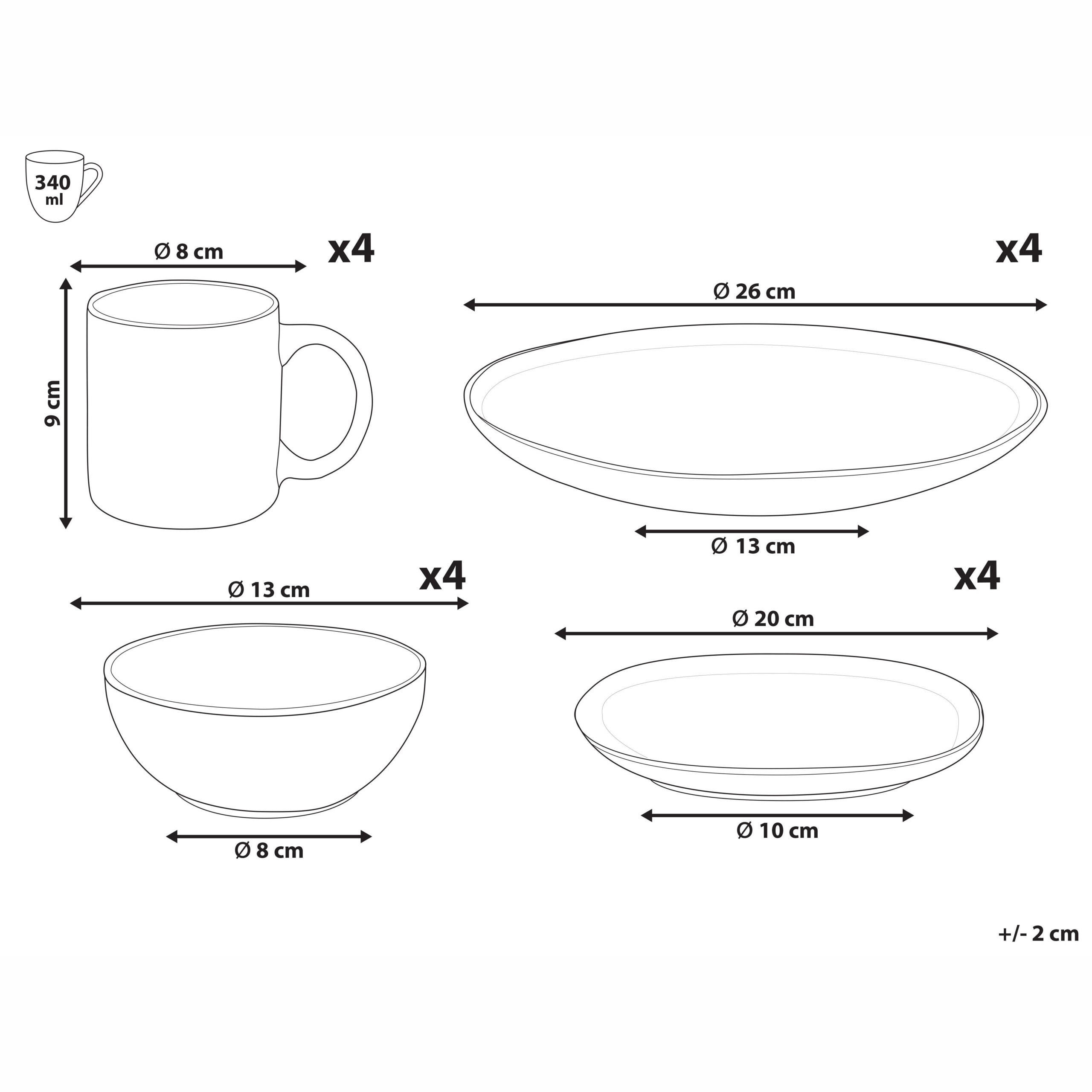 Viehättävä ruokailusetti neljälle. Valmistaudu ruokailukokemukseen, joka jättää vaikutuksen kullanruskealla viehätyksellään. Tämä 16-osainen setti on suunniteltu palvelemaan neljää henkeä ja se on valmistettu huolella kivitavarasta. Jokaisessa osassa on lumoava reaktiivinen lasituspinta, joka takaa, ettei yksikään elementti ole täsmälleen identtisesti samanlainen. Astiasto tuo pöytään ainutlaatuisen ja jäljittelemättömän kosketuksen modernia käytännöllisyyttä ja eleganttia esteettisyyttä. Astianpesukone- ja mikroaaltouuninkestäviä.