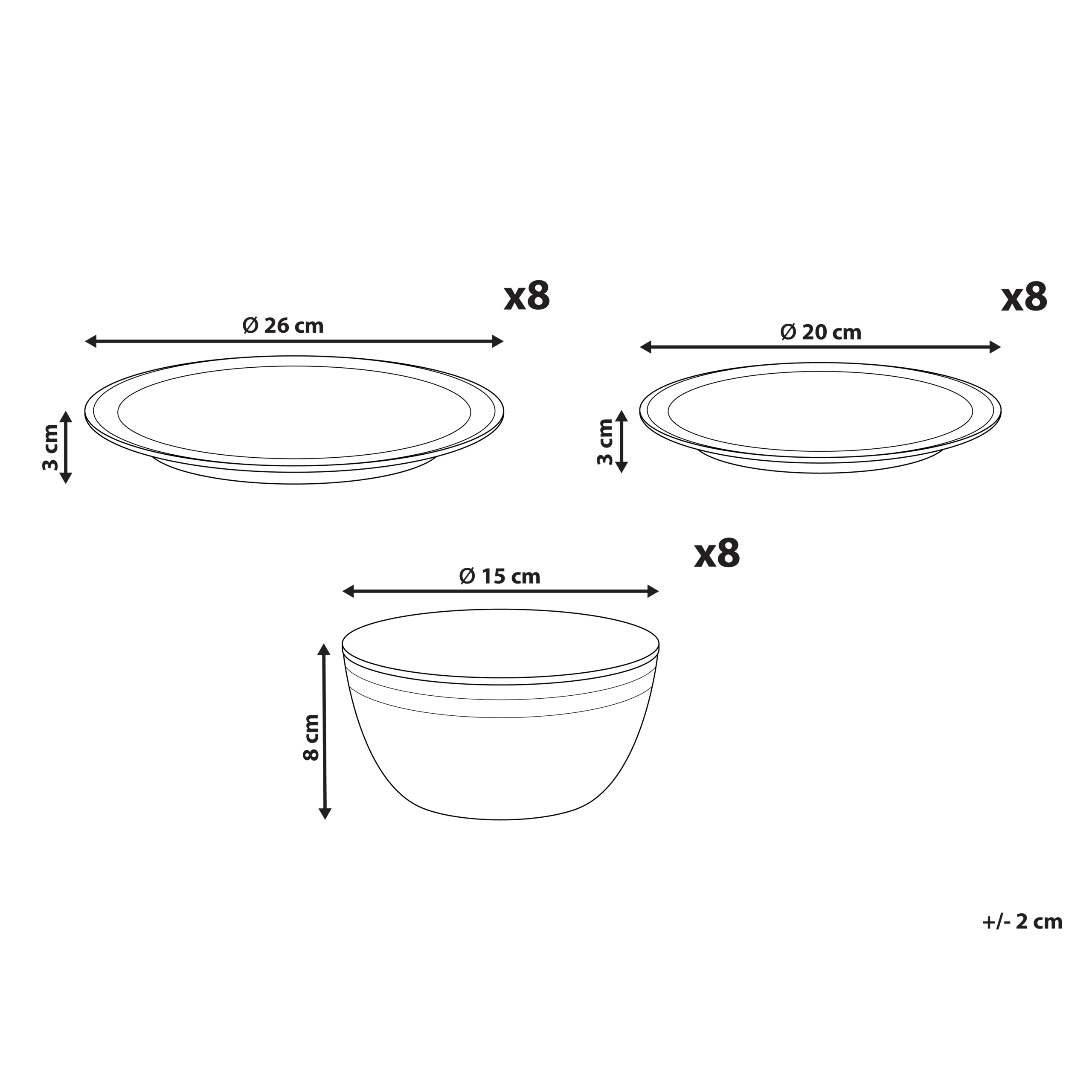 Hintaan sisältyy: 8 x Kulho, 8 x Ruokalautanen, 8 x Sivulautanen