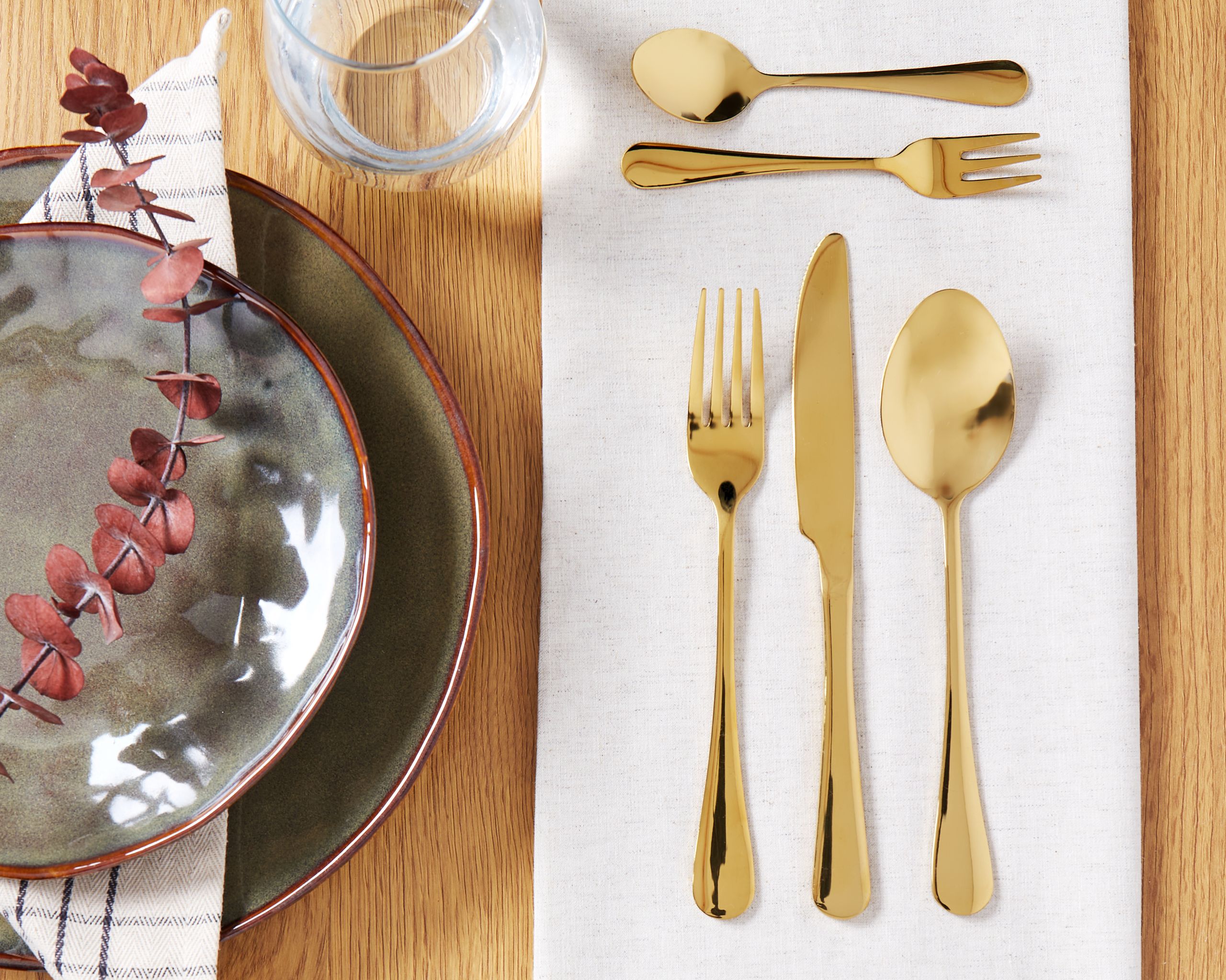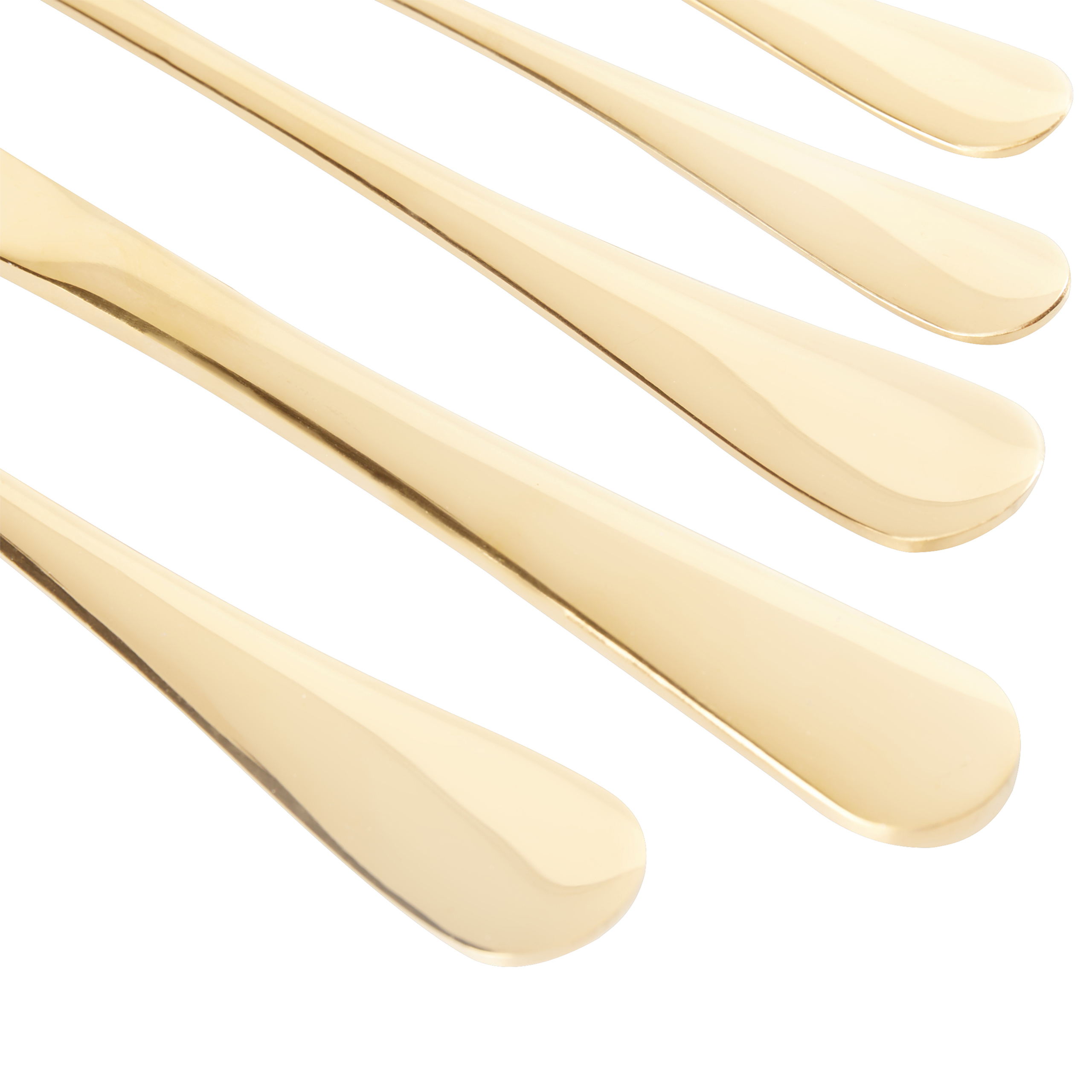 Ruokailuvälinesetti kuudelle hengelle teelusikoilla ja kakkuhaarukoilla. Tyylikäs aterinsetti huokuu nykyaikaista eleganssia, ja sen kiiltävä, kultainen viimeistely tuo hienostunutta ilmettä mihin tahansa ruokapöytään. Laadukkaasta ruostumattomasta teräksestä valmistettu setti lupaa kestävyyttä, ja se on suunniteltu täydentämään sekä moderneja että perinteisiä astiastoja. Kaikkien osien kahvat ovat hieman kaarevia, mikä tekee niiden käytöstä entistäkin miellyttävämpää. Täydellinen niille, jotka arvostavat ruokailussaan rohkeaa ilmettä, tämä setti sisältää aterimen kaikille ruokalajeille, aina alkupaloista jälkiruokiin.