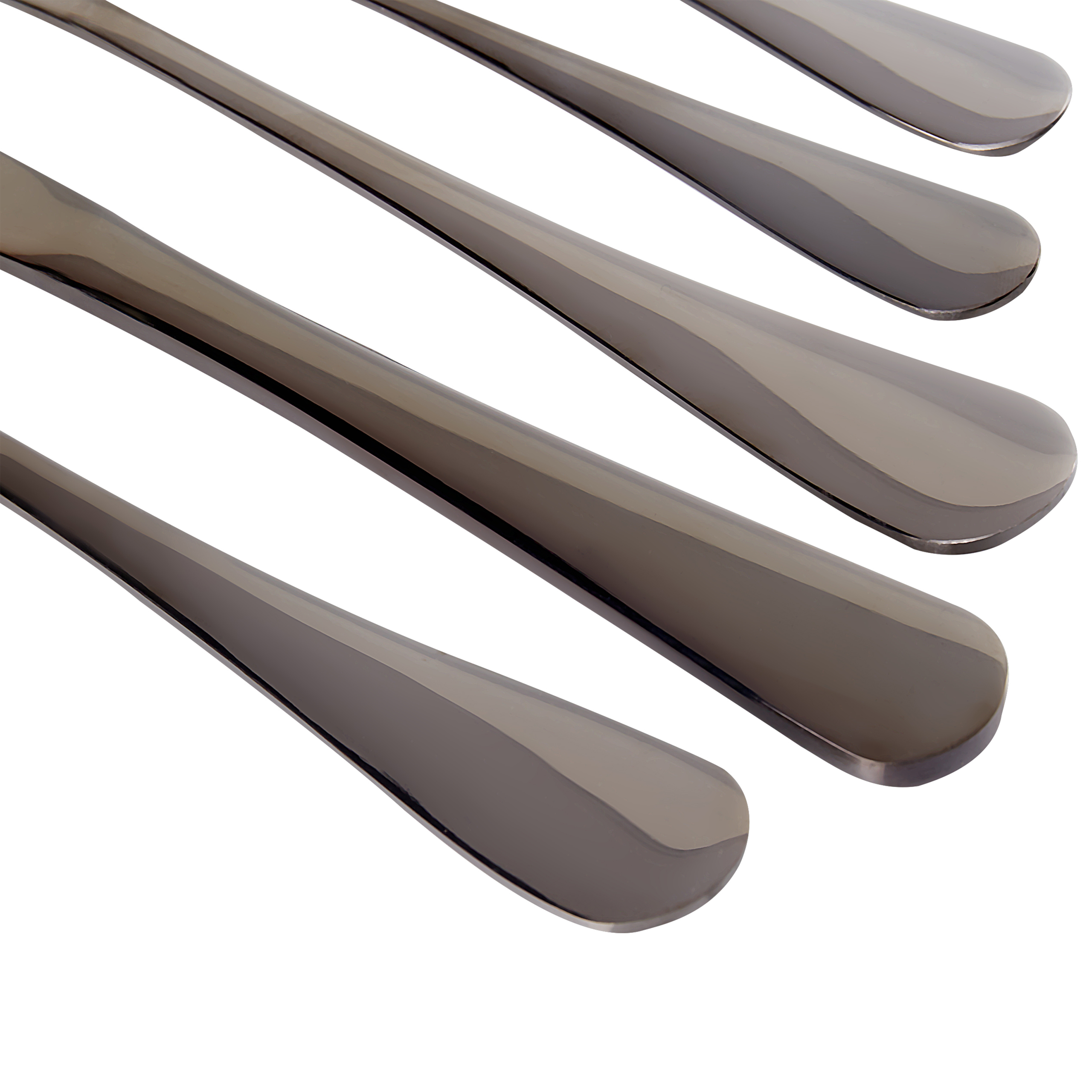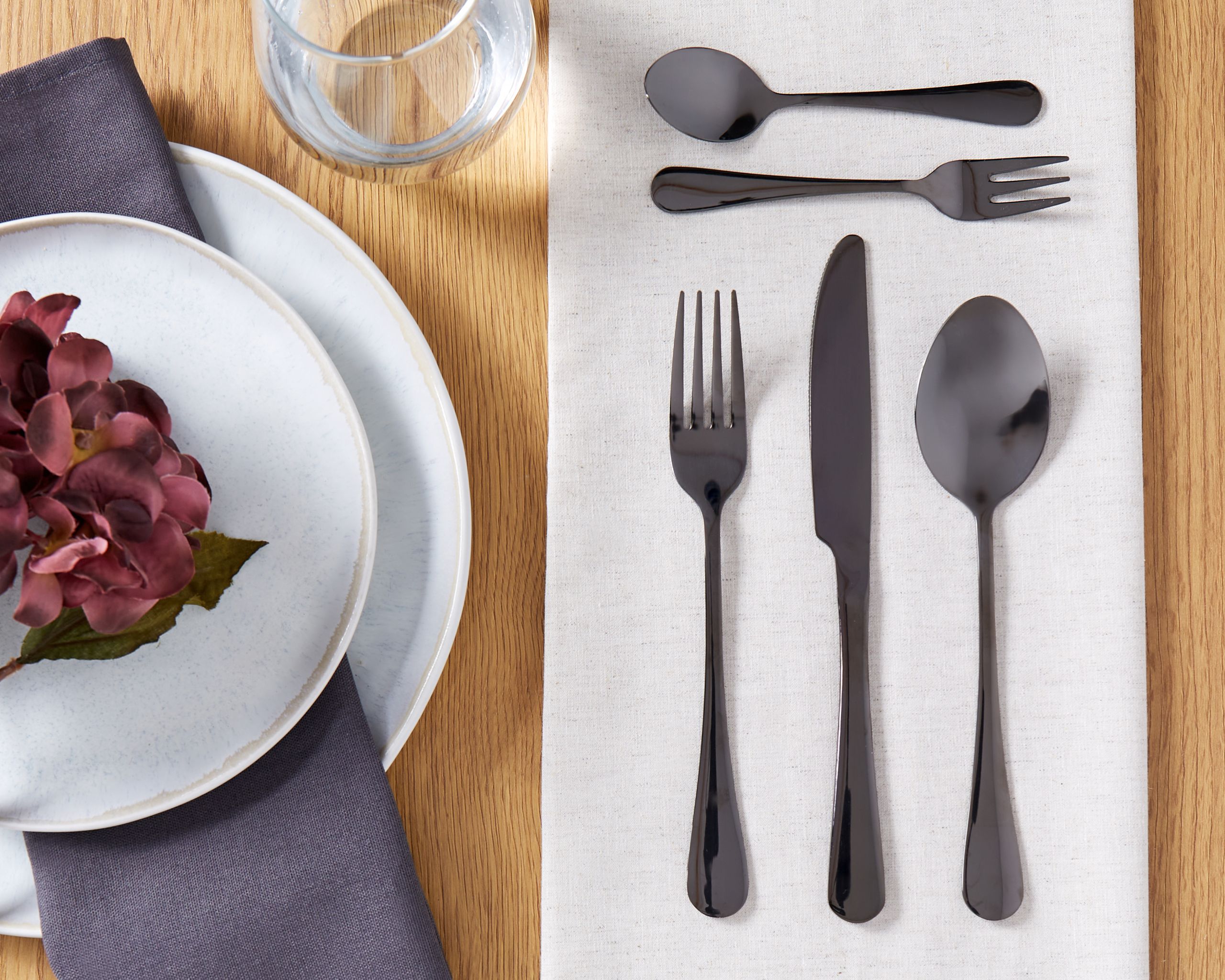 Ruokailuvälinesetti kuudelle hengelle teelusikoilla ja kakkuhaarukoilla. Tyylikäs aterinsetti huokuu nykyaikaista eleganssia, ja sen kiiltävä, musta viimeistely tuo hienostunutta ilmettä mihin tahansa ruokapöytään. Laadukkaasta ruostumattomasta teräksestä valmistettu setti lupaa kestävyyttä, ja se on suunniteltu täydentämään sekä moderneja että perinteisiä astiastoja. Kaikkien osien kahvat ovat hieman kaarevia, mikä tekee niiden käytöstä entistäkin miellyttävämpää. Täydellinen niille, jotka arvostavat ruokailussaan rohkeaa ilmettä, tämä setti sisältää aterimen kaikille ruokalajeille, aina alkupaloista jälkiruokiin.