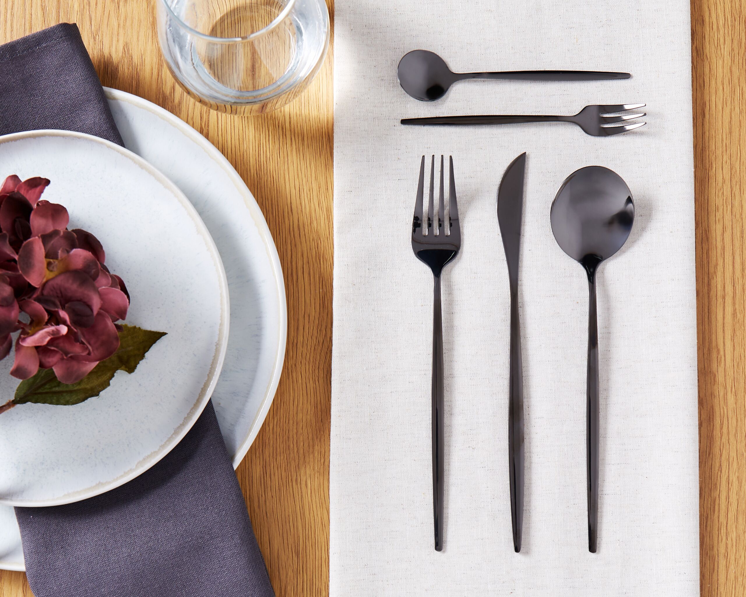 Kuuden hengen ruokailuvälinesetti teelusikoilla ja kakkuhaarukoilla. Tuo ruokapöytään ripaus hienostuneisuutta tällä tyylikkäällä aterinsetillä. Jokainen osa on valmistettu korkealaatuisesta mustanvärisestä ruostumattomasta teräksestä, joka tarjoaa sekä poikkeuksellista kestävyyttä että kiiltoa. Sirot, pitkulaiset kahvat tuovat ruokailuvälineisiin siroa ilmettä ja tasapainoa, joka sopii täydellisesti nykyaikaisiin ruokailutiloihin. Koska siihen kuuluu 5 erilaista osaa, voit käyttää sitä erilaisissa tilanteissa – juhlallisista illallisista jälkiruokineen aina rentoihin tapaamisiin ystävien kanssa.