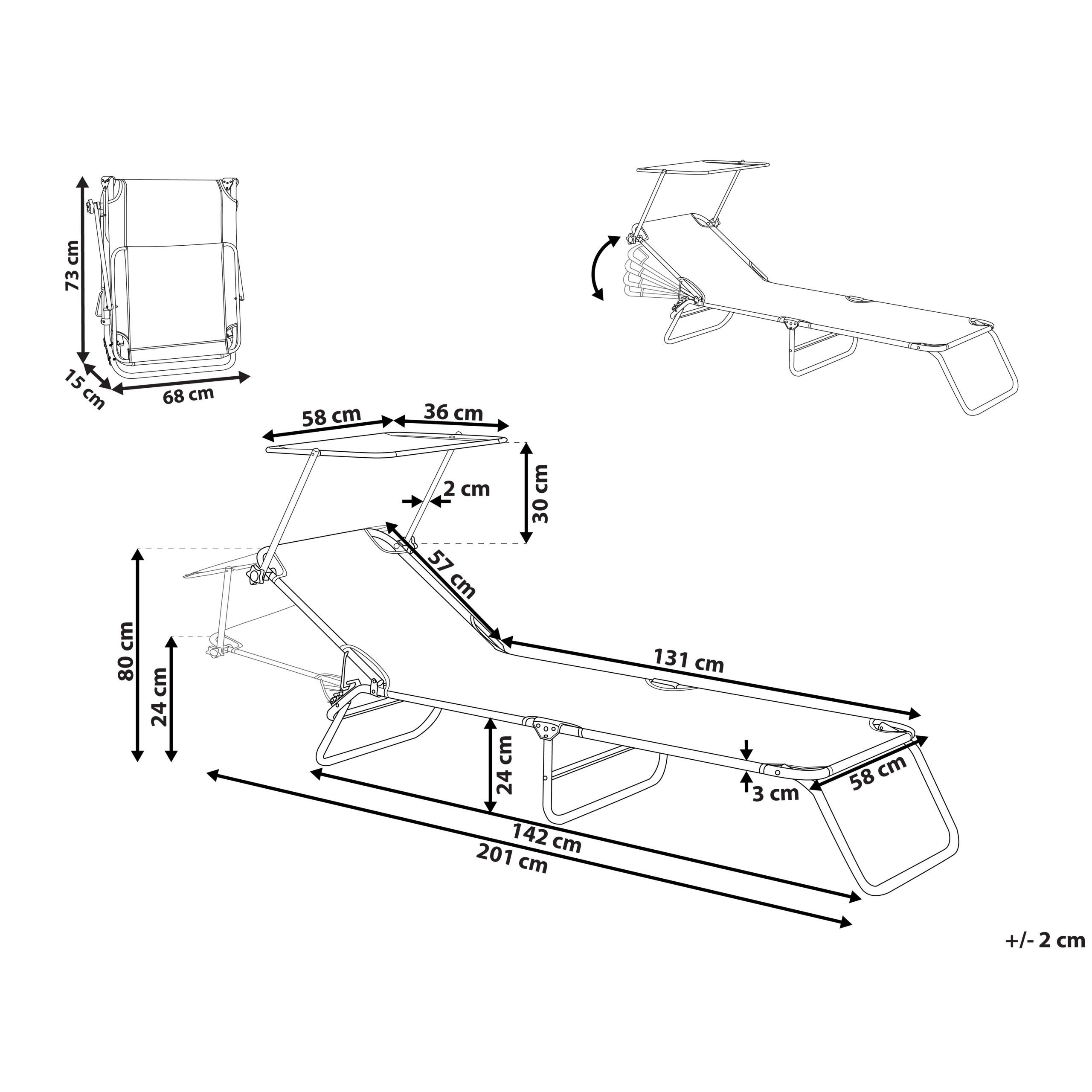 Kokoontaitettava aurinkotuoli säädettävällä selkänojalla ja katoksella. Nauti aurinkoisista päivistä puutarhassa, takapihalla tai terassilla tällä modernilla aurinkotuolilla. Vankasta ja ruosteenkestävästä jauhemaalatusta teräksestä valmistettua runkoa täydentää makuuosan laadukas polyesterikangas, jonka trendikäs sävy tuo tyyliä mihin tahansa ulkotilaan. Aurinkotuoli on helppo taittaa kokoon säilytystä ja kuljetusta varten, ja kätevät kantokahvat lisäävät käytännöllisyyttä. Irrotettava, säädettävä katos tarjoaa mukavan suojan auringolta. Kallistettavan selkänojan ansiosta se sopii täydellisesti niin auringonottoon kuin kirjan lukemiseenkin.