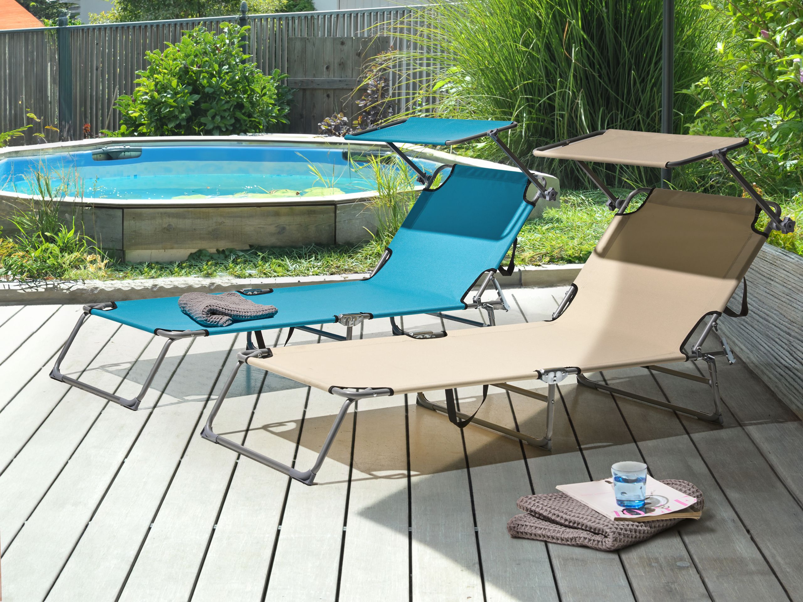 Kokoontaitettava aurinkotuoli säädettävällä selkänojalla ja katoksella. Nauti aurinkoisista päivistä puutarhassa, takapihalla tai terassilla tällä modernilla aurinkotuolilla. Vankasta ja ruosteenkestävästä jauhemaalatusta teräksestä valmistettua runkoa täydentää makuuosan laadukas polyesterikangas, jonka trendikäs sävy tuo tyyliä mihin tahansa ulkotilaan. Aurinkotuoli on helppo taittaa kokoon säilytystä ja kuljetusta varten, ja kätevät kantokahvat lisäävät käytännöllisyyttä. Irrotettava, säädettävä katos tarjoaa mukavan suojan auringolta. Kallistettavan selkänojan ansiosta se sopii täydellisesti niin auringonottoon kuin kirjan lukemiseenkin.
