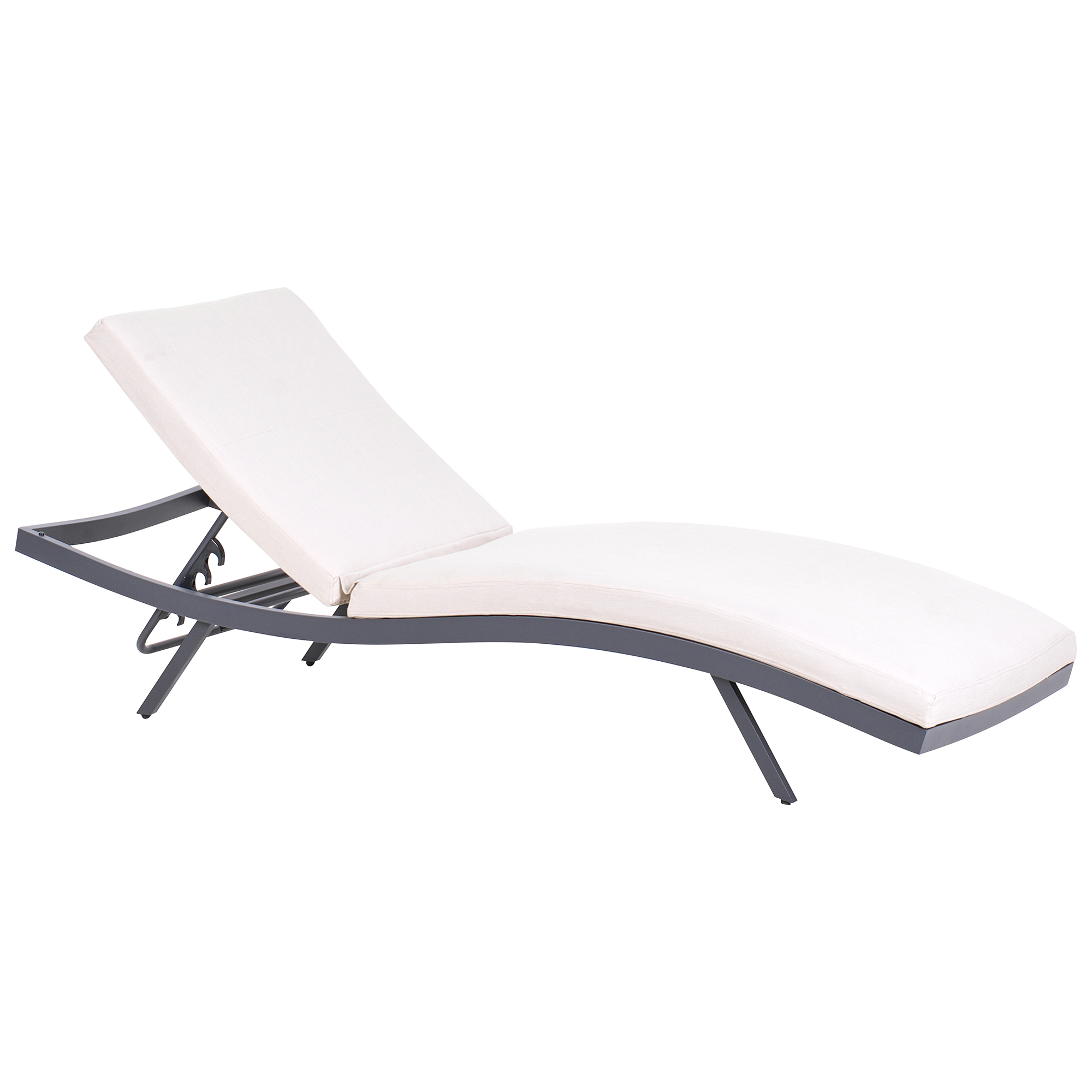 Moderni aurinkotuoli säädettävällä selkänojalla. Tämä moderni, kallistettava aurinkotuoli tarjoaa täydellisen paikan rentoutua ja nauttia kesäpäivistä auringossa. Neljään asentoon säädettävä selkänoja mahdollistaa säätämisen tarpeen mukaan, joten voit vaihtaa auringonpalvonnasta kirjan lukemiseen käden käänteessä. Kaareva muoto ja paksut, nopeasti kuivuvalla vaahtomuovilla täytetyt tyynyt tekevät siitä erittäin mukavan. Kestävä musta alumiinirunko takaa vakauden ja pitkäikäisyyden sekä täydentää vaaleanbeigejä tyynyjä kauniisti.