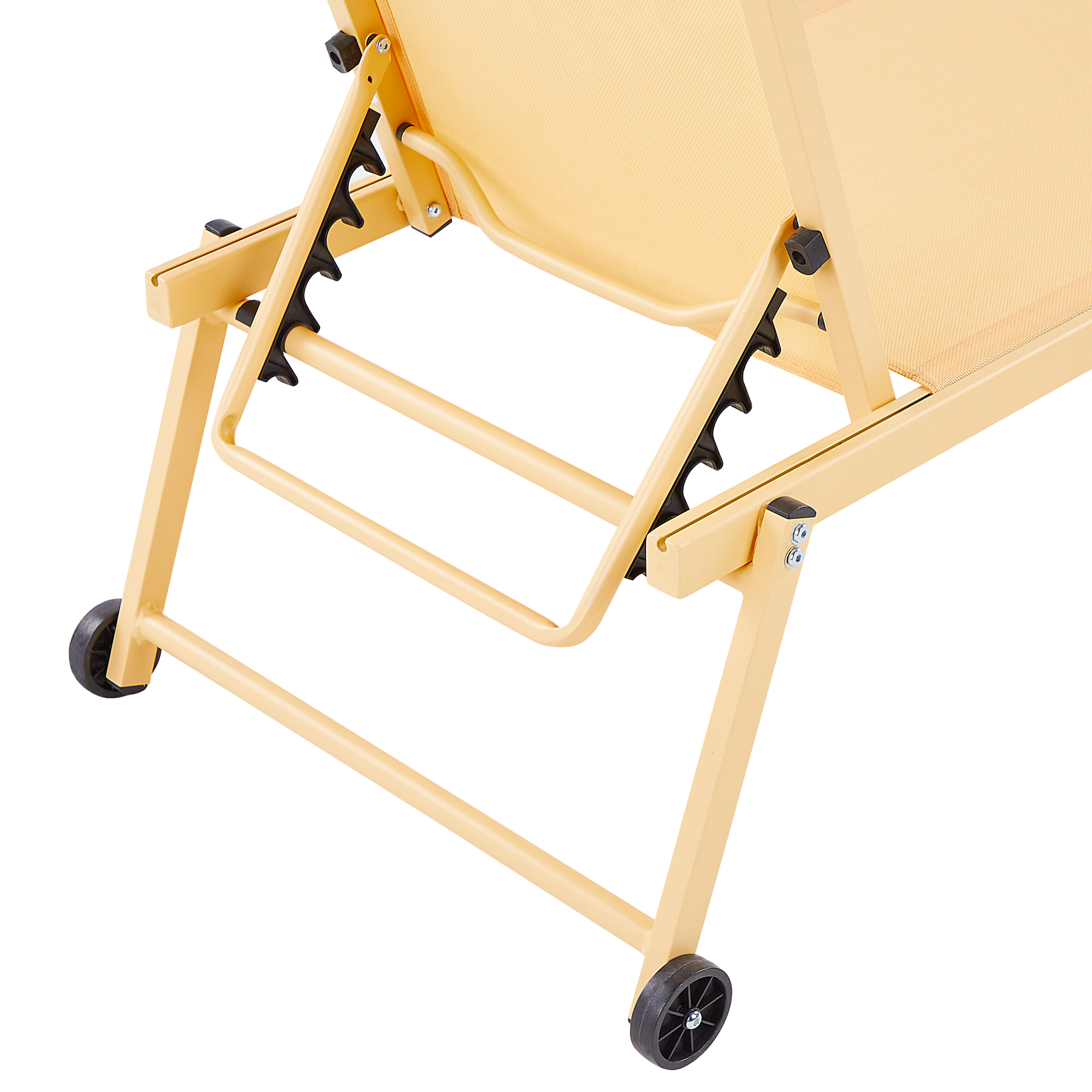 Lepotuoli puutarhaan. Nauti auringosta puutarhassasi tai terassillasi tällä käytännöllisellä aurinkotuolilla. Säädettävän selkänojan ansiosta voit nostaa tai laskea selkänojaa tarpeidesi mukaan. Aurinkotuolin runko on valmistettu laadukkaasta ja kevyestä jauhemaalatusta alumiinista. Käytännölliset pyörät mahdollistavat, että aurinkotuolia on helppo siirtää paikasta toiseen. Makuuosa on valmistettu kestävästä ja helppohoitoisesta tekstiilikuidusta. Kaunis keltainen väri ja yksinkertainen muotoilu antavat aurinkotuolille modernin ilmeen, joka sopii useisiin erilaisiin sisustuksiin.