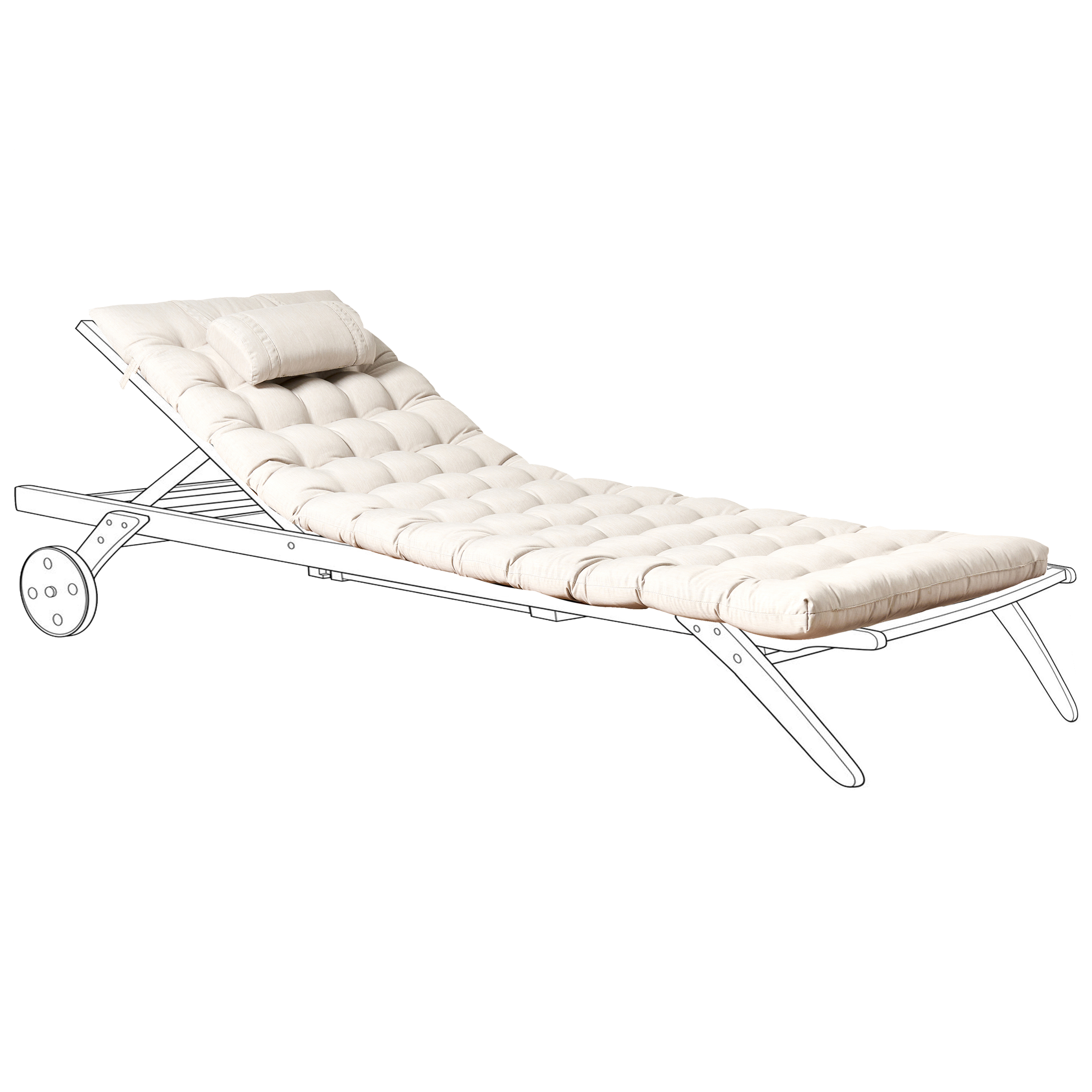 Tuftattu aurinkotuolin tyyny niskatuella ja siteillä. Tämä tyylikäs ja runsaasti pehmustettu aurinkotuolin pehmuste antaa poikkeuksellista mukavuutta rentoutumiseen ulkona. Syvät tuftaukset ja tyylikäs niskatuki tuovat ripauksen modernia viehätystä mihin tahansa ulkotilaan. Pehmusteen päällinen on valmistettu kestävästä ja helppohoitoisesta polyesterikankaasta, joka kestää kevyttä sadetta ja UV-säteilyä. Se viimeistelee minkä tahansa aurinkotuolin, tarjoten täydellisen yhdistelmän toimivuutta ja tyyliä.