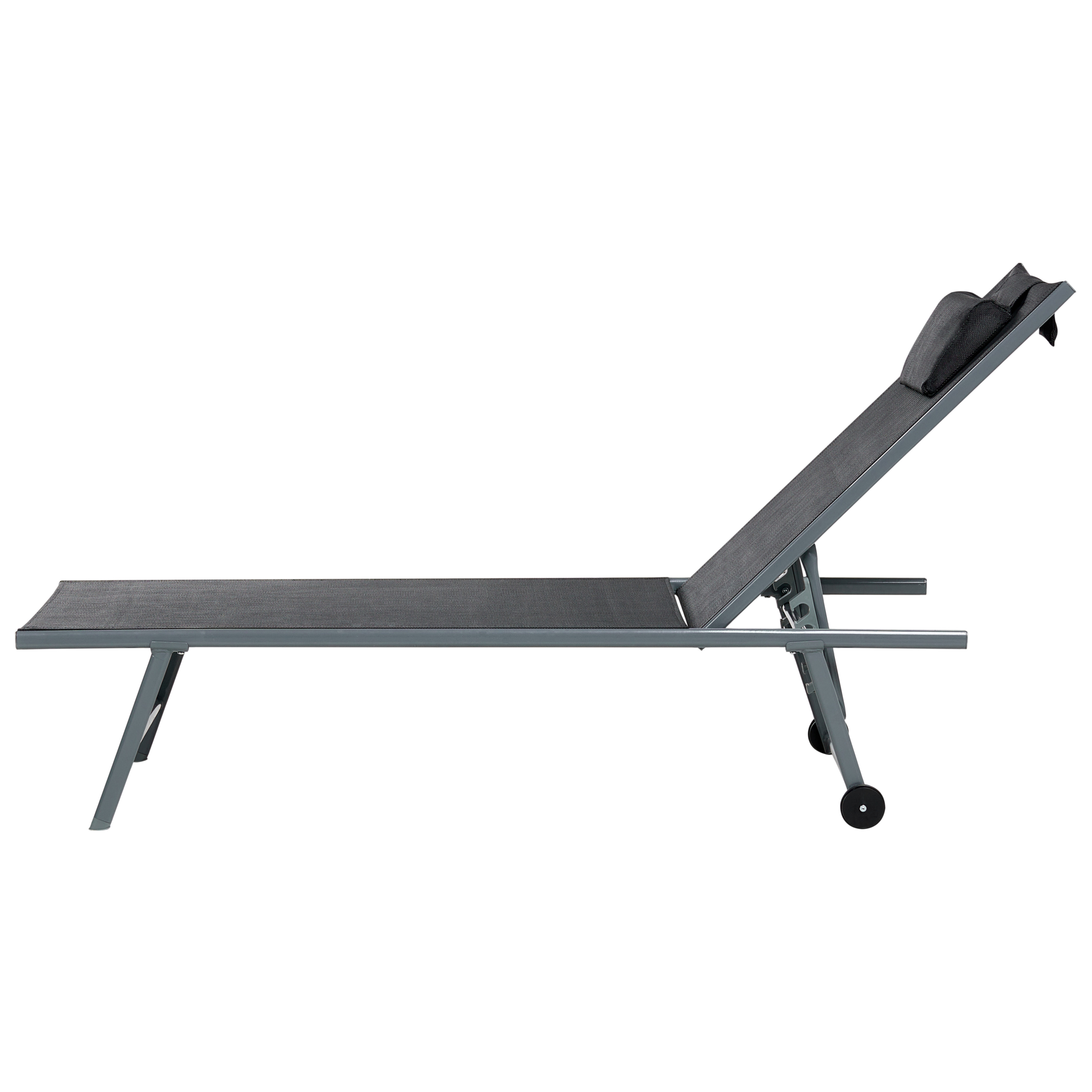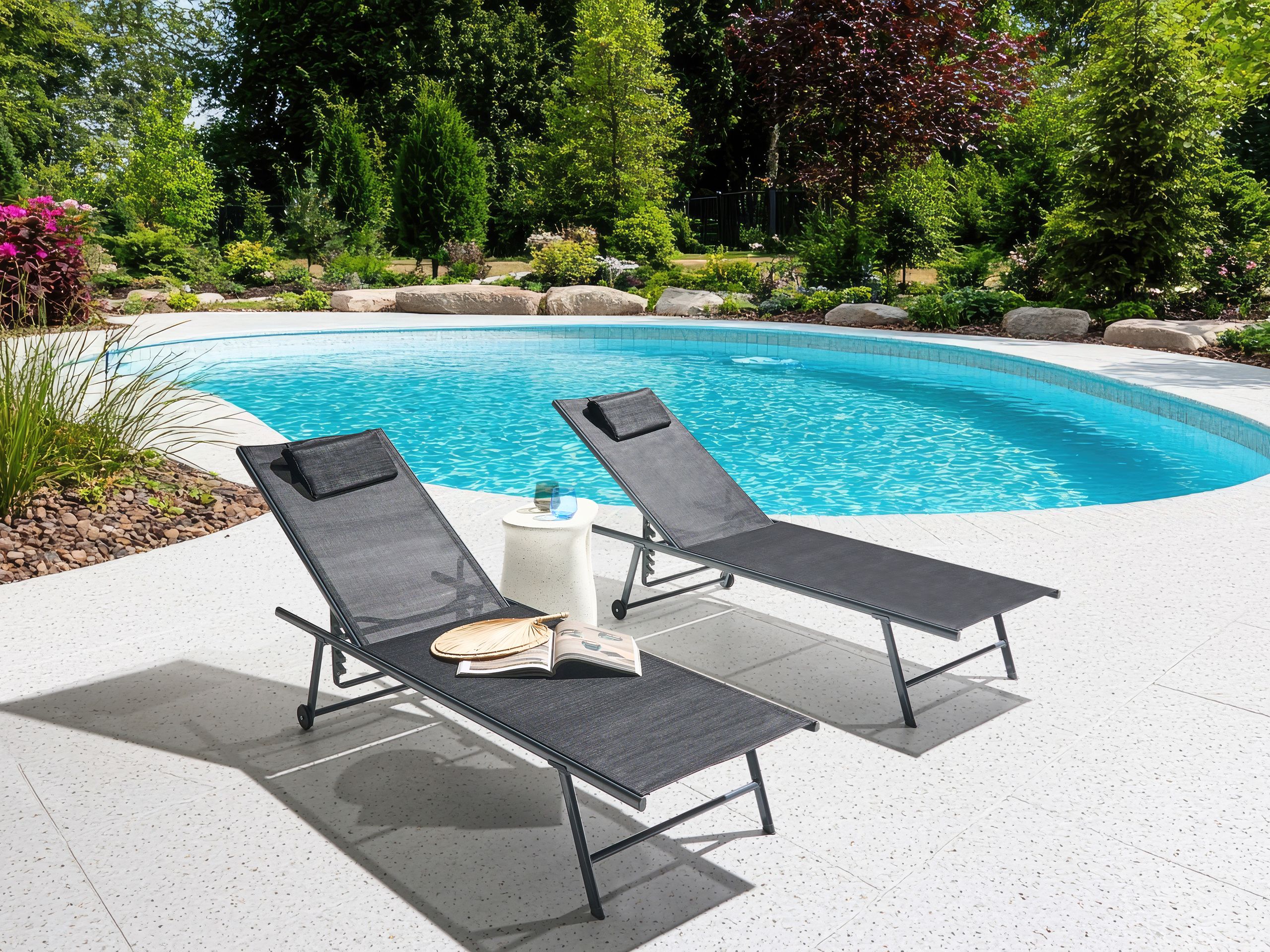 Moderni kahden aurinkotuolin setti säädettävillä selkänojilla. Rentoudu tyylillä tällä kahden mukavan aurinkotuolin setillä. Tukevasta teräksestä valmistettuja runkoja täydentävät kestävästä polyesterikankaasta valmistetut makuuosat ja viiteen asentoon säädettävät selkänojat. Kunkin aurinkotuolin mukana tulee myös pieni niskatyyny, joka tarjoaa lisätukea. Aurinkotuolit sopivat täydellisesti pitkiin rentoutumishetkiin ulkona puutarhassa, terassilla tai uima-altaalla.