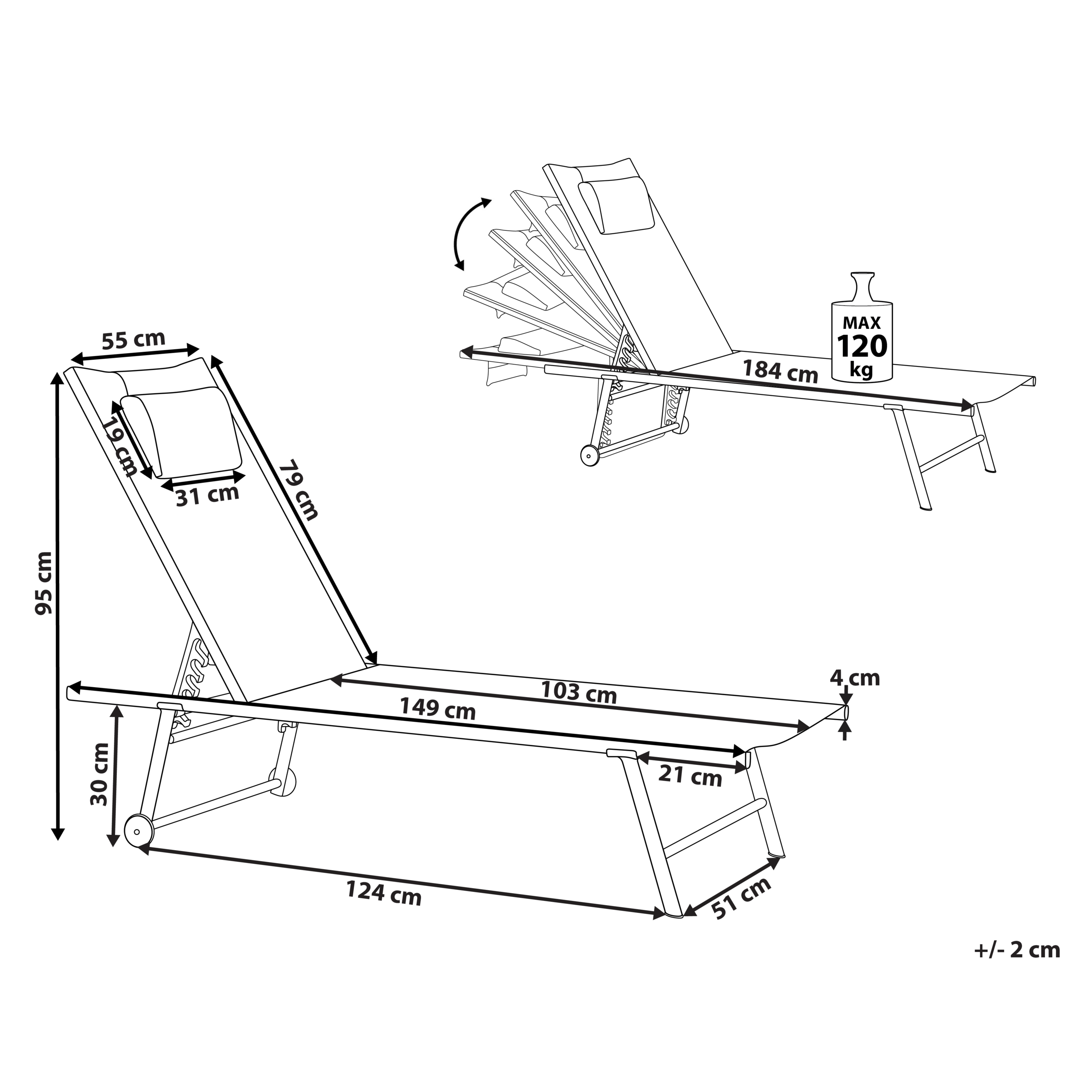 Ominaisuudet: Selkänoja säädettävissä viiteen eri asentoon, Nopea ja helppo tyynyjen kiinnitys tarranauhan ansiosta, Loistava paikka rentoutua, Modernia tyyliä terassille ja puutarhaan, Vedenpitävä korkeatasoisten materiaalien ansiosta