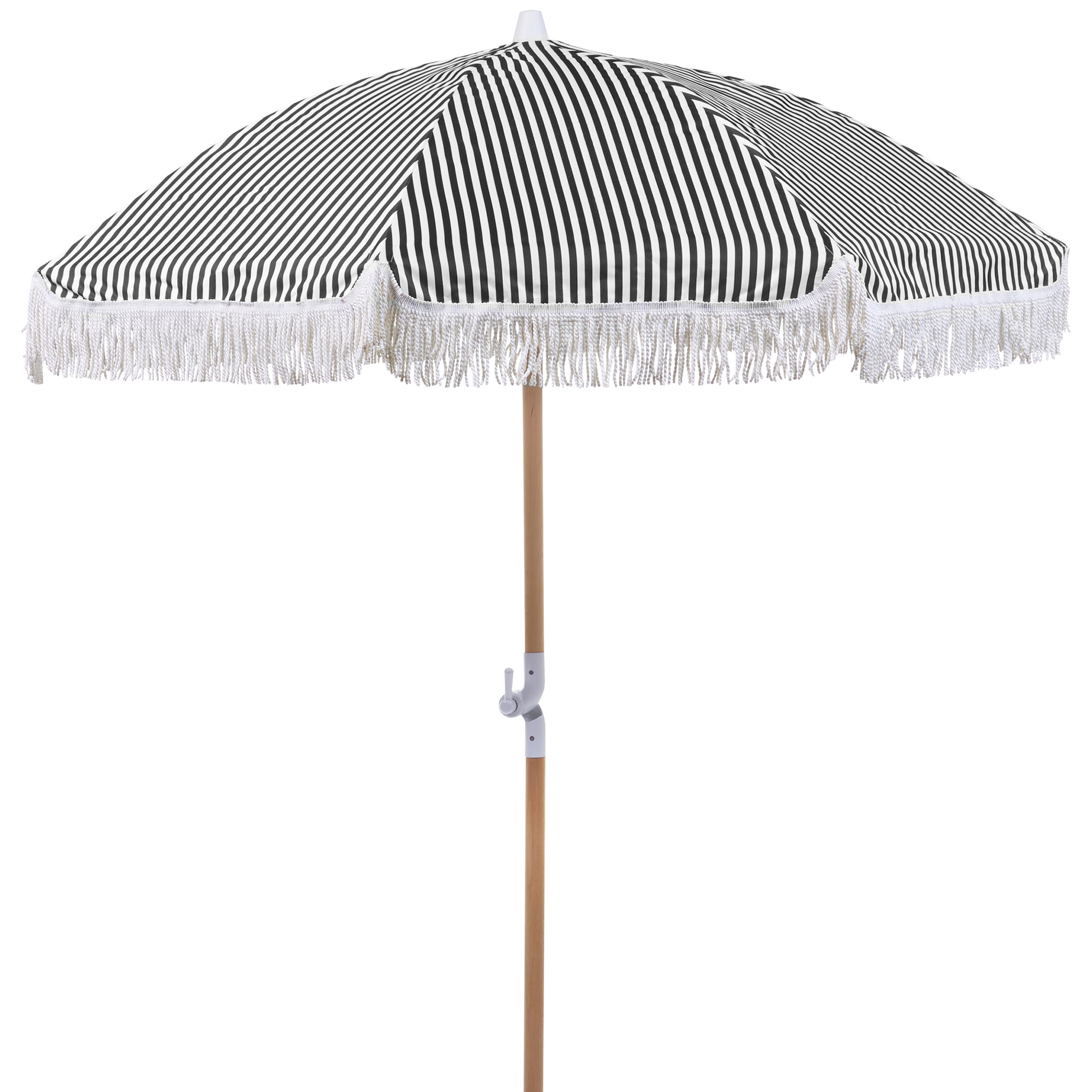 Retrotyylinen päivänvarjo hapsuilla. Kalusta ulkotila tällä aurinkovarjolla, joka kohottaa tilan ilmettä välittömästi ja tuo retrotunnelmaa. Valkoisista ja mustista raidoista koostuvaa varjoa täydentävät liepeestä roikkuvat kauniit beiget hapsut. Laadukas ja kestävä pyökkivarsi kestää hyvin erilaisia sääolosuhteita. Kierrätetystä polyesterikankaasta valmistettu varjo on UV-säteilyä ja kosteutta kestävä, tarjoten varjoisan ja suojaisan paikan auringolta. Kallistusominaisuuden ansiosta aurinkovarjo voidaan kääntää eri asentoon tarpeen mukaan. Mukana tuleva kahvoilla varustettu säilytyspussi mahdollistaa helpon kuljetuksen ja säilytyksen.