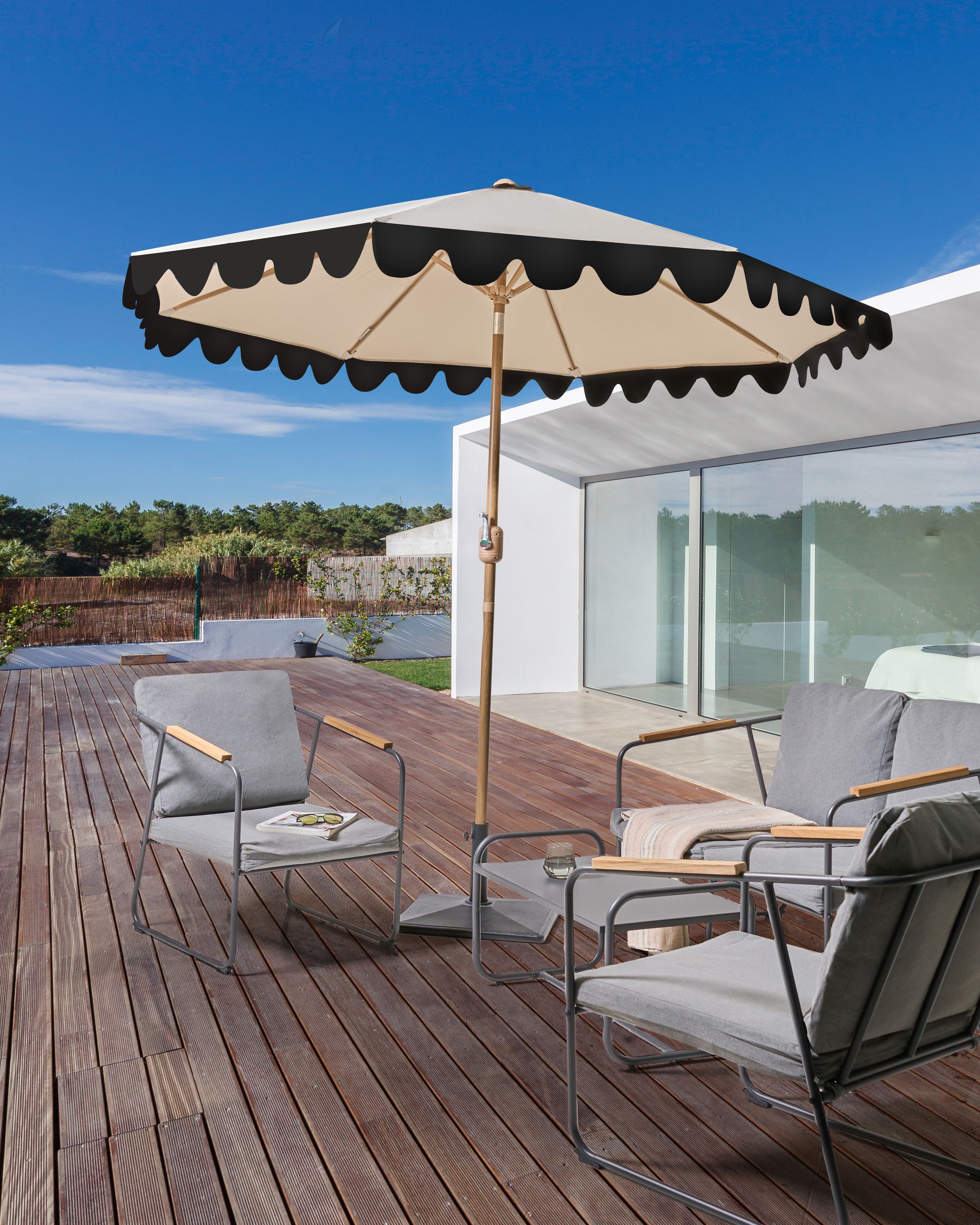 Pyöreä kallistettava puutarhan päivänvarjo. Tämä viehättävä aurinkovarjo on sekä käytännöllinen että tyylikäs. Siinä on säädettävä kupu, jonka ansiosta varjoa on mahdollista säätää päivänajan mukaan. Polyesterikangas kestää UV-säteitä, tuulta, tahroja ja kevyttä sadetta, joten varjo säilyttää kauniin ulkonäkönsä sääolosuhteista huolimatta. Tukevassa alumiinivarressa on kaunis puukuvio, joka lisää ulkotilaan hienostunutta ilmettä.