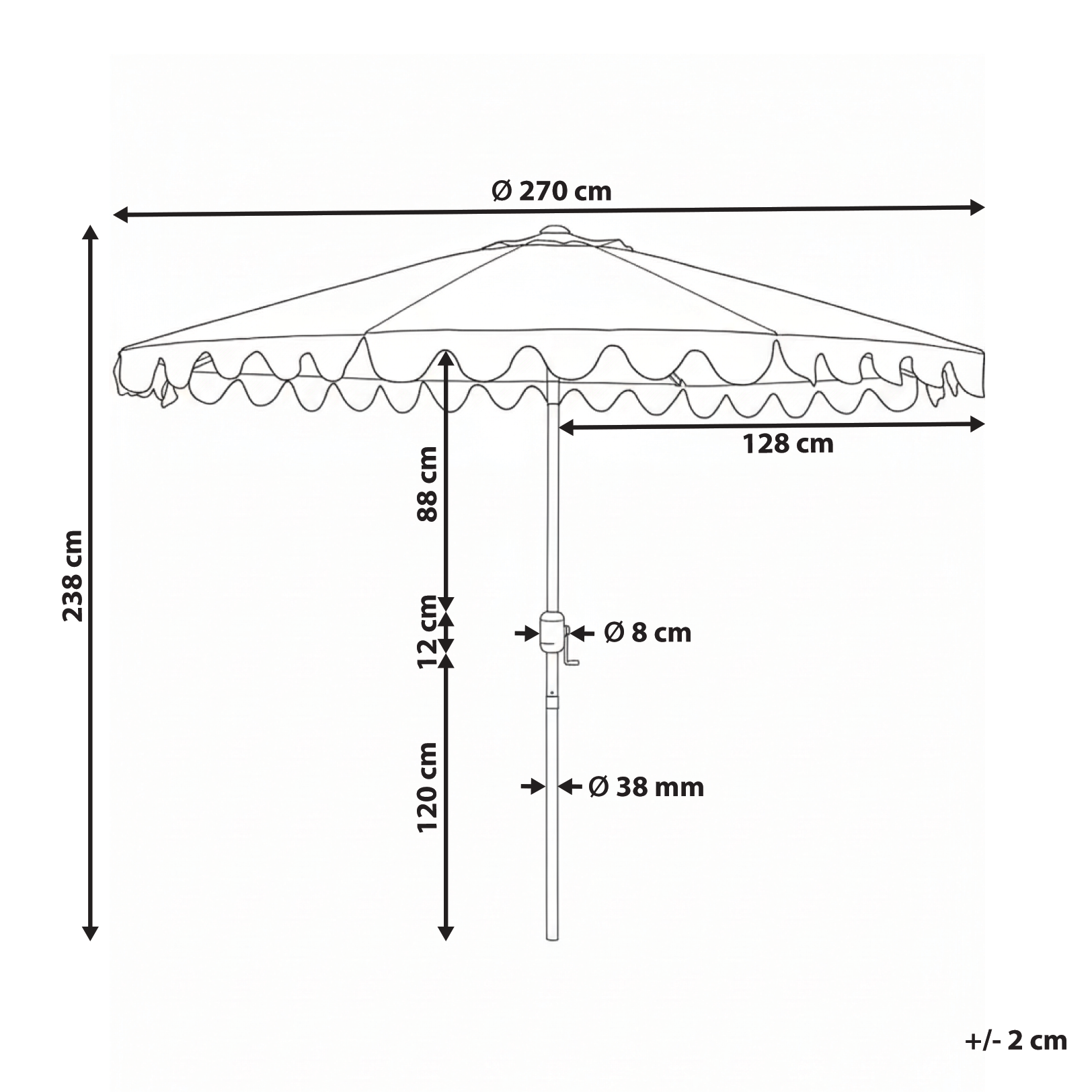 Pyöreä kallistettava puutarhan päivänvarjo. Tämä viehättävä aurinkovarjo on sekä käytännöllinen että tyylikäs. Siinä on säädettävä kupu, jonka ansiosta varjoa on mahdollista säätää päivänajan mukaan. Polyesterikangas kestää UV-säteitä, tuulta, tahroja ja kevyttä sadetta, joten varjo säilyttää kauniin ulkonäkönsä sääolosuhteista huolimatta. Tukevassa alumiinivarressa on kaunis puukuvio, joka lisää ulkotilaan hienostunutta ilmettä.