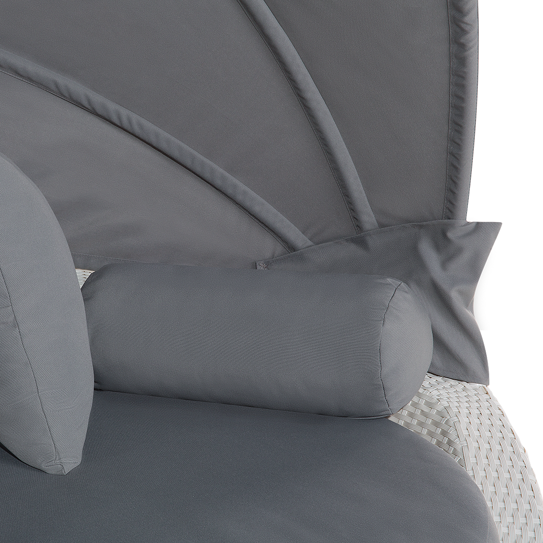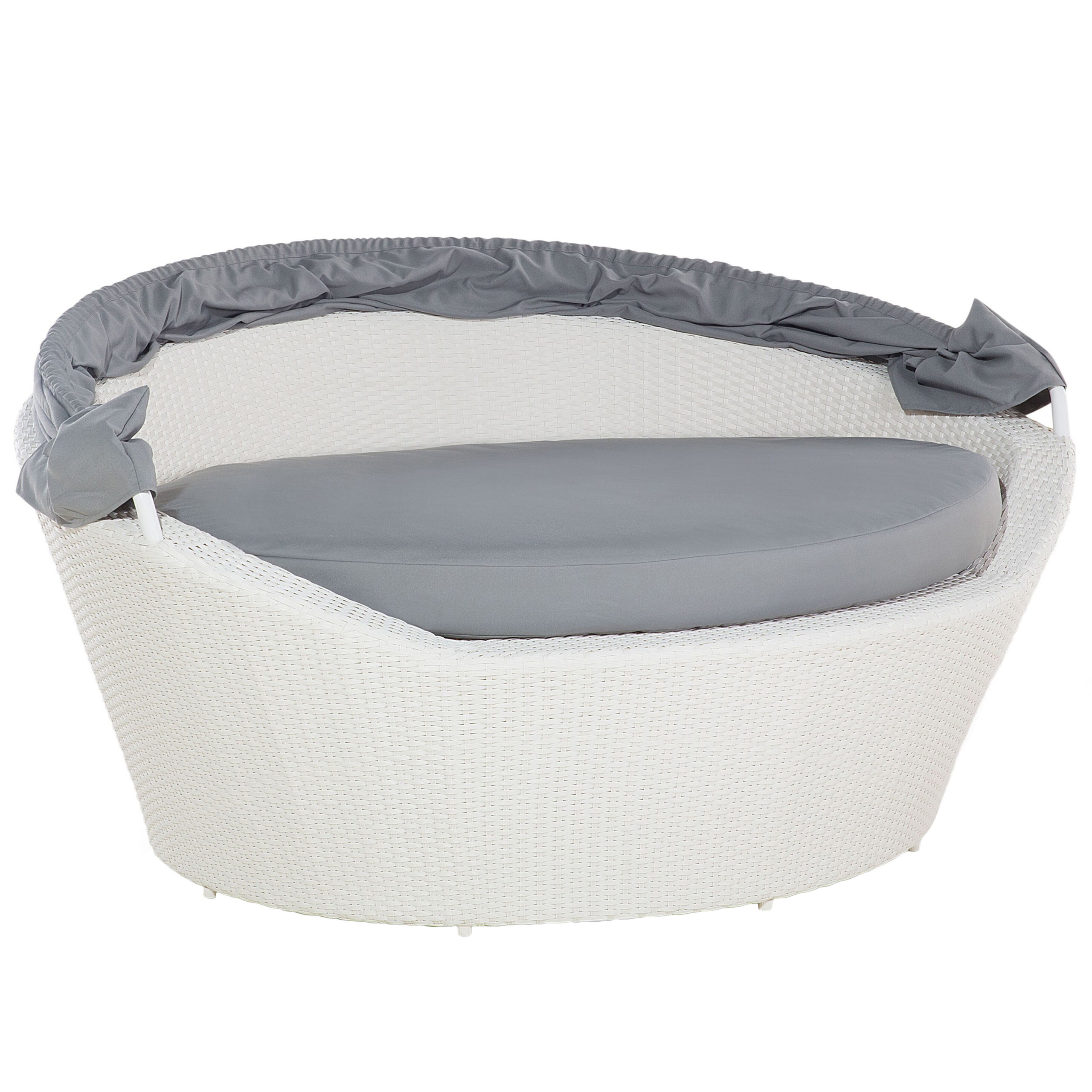Pyöreä aurinkovuode katoksella. Tämä aurinkovuode yhdistää tukevan rakenteen ja ylellisen muotoilun täydellisesti. Se luo ulkotiloihin paikan, jossa voit rentoutua kauniista säästä nauttien. Mukana tulevat pehmusteet ja tyynyt takaavat mukavuuden. Katos on säädettävissä, joten pitää sen ylhäällä tai laskea sen alas. Kestävä alumiinirunko on päällystetty polyrottingilla ja sohvapöydän taso on kestävää karkaistua lasia. Neutraalit värit saavat aurinkovuoteen sopimaan useisiin erilaisiin sisustuksiin.