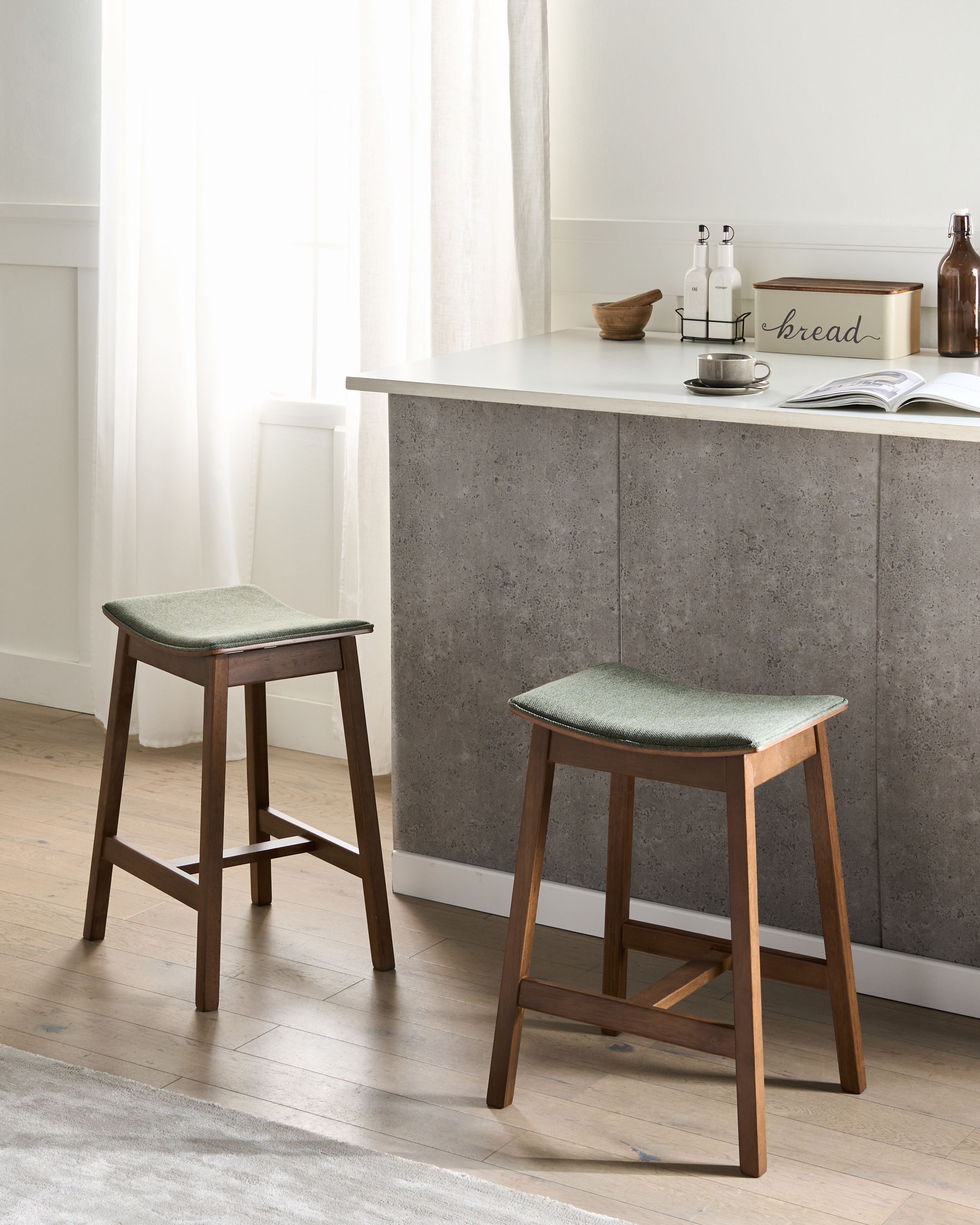 Minimalistinen baarijakkarasetti kangasistuimilla. Lisää ripaus eleganssia baaritiskin tai keittiön saarekkeen ääreen tällä kahden baarijakkaran setillä. Kestävästä kumipuusta valmistetuissa jakkaroissa on pehmeät, polyesterikankaalla verhoillut istuimet, minkä ansiosta ne ovat sekä mukavat että pitkäikäiset. Minimalistinen muotoilu sulautuu useisiin sisustustyyleihin, tuoden tilaan tyyliä.