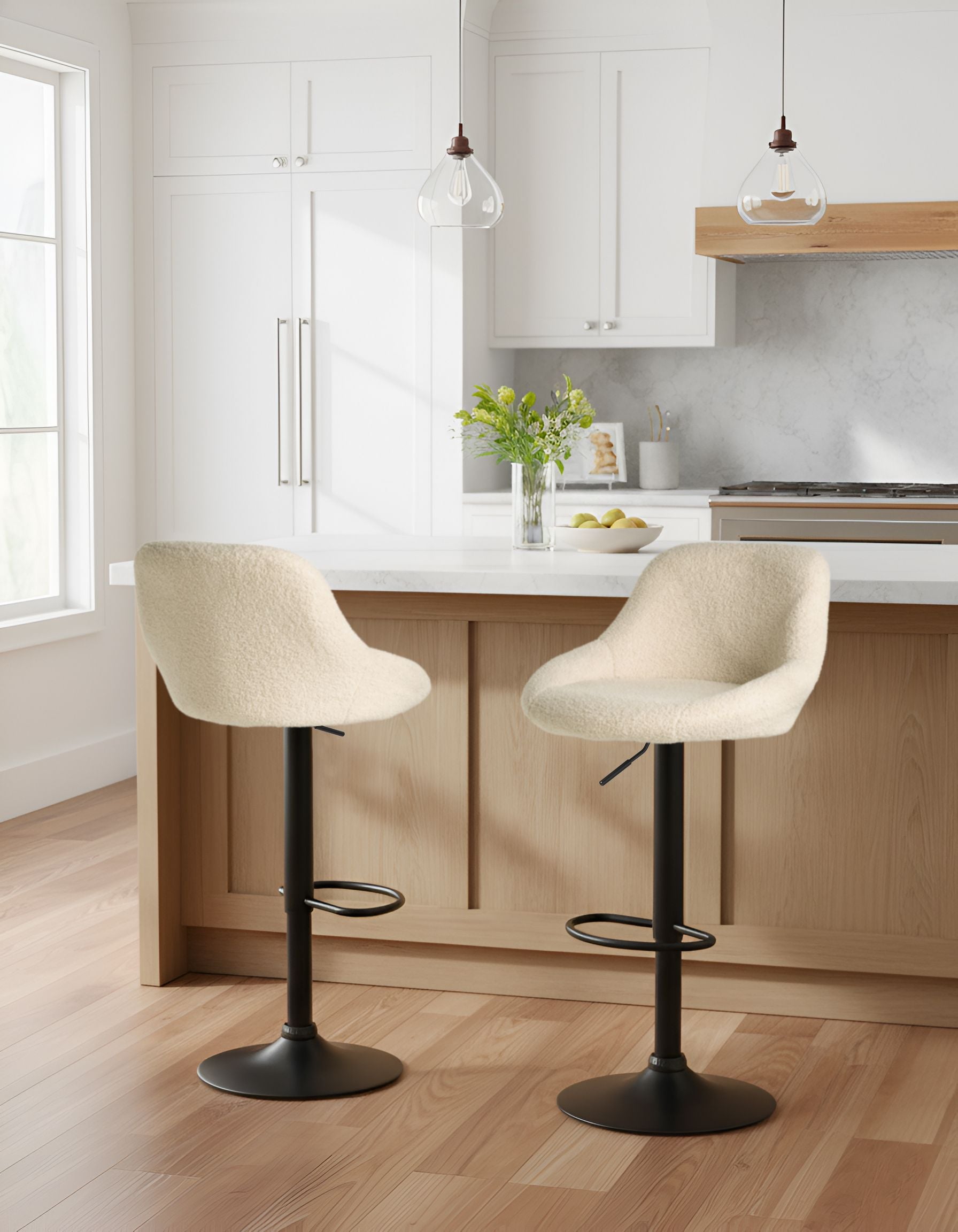 Nykyaikaiset baarituolit bukleeistuimilla. Tämä kahden baarijakkaran setti yhdistää modernin muotoilun ja käytännöllisyyden. 360 astetta kääntyvän jalustan ja säädettävän korkeuden ansiosta tuolit sopivat täydellisesti keittiön saarekkeeseen tai baaripöydän ääreen. Bukleeverhoillut istuimet ja selkänojat tarjoavat mukavuutta, ja tukevat jauhemaalatut rautajalustat takaavat vakauden sekä kestävyyden.