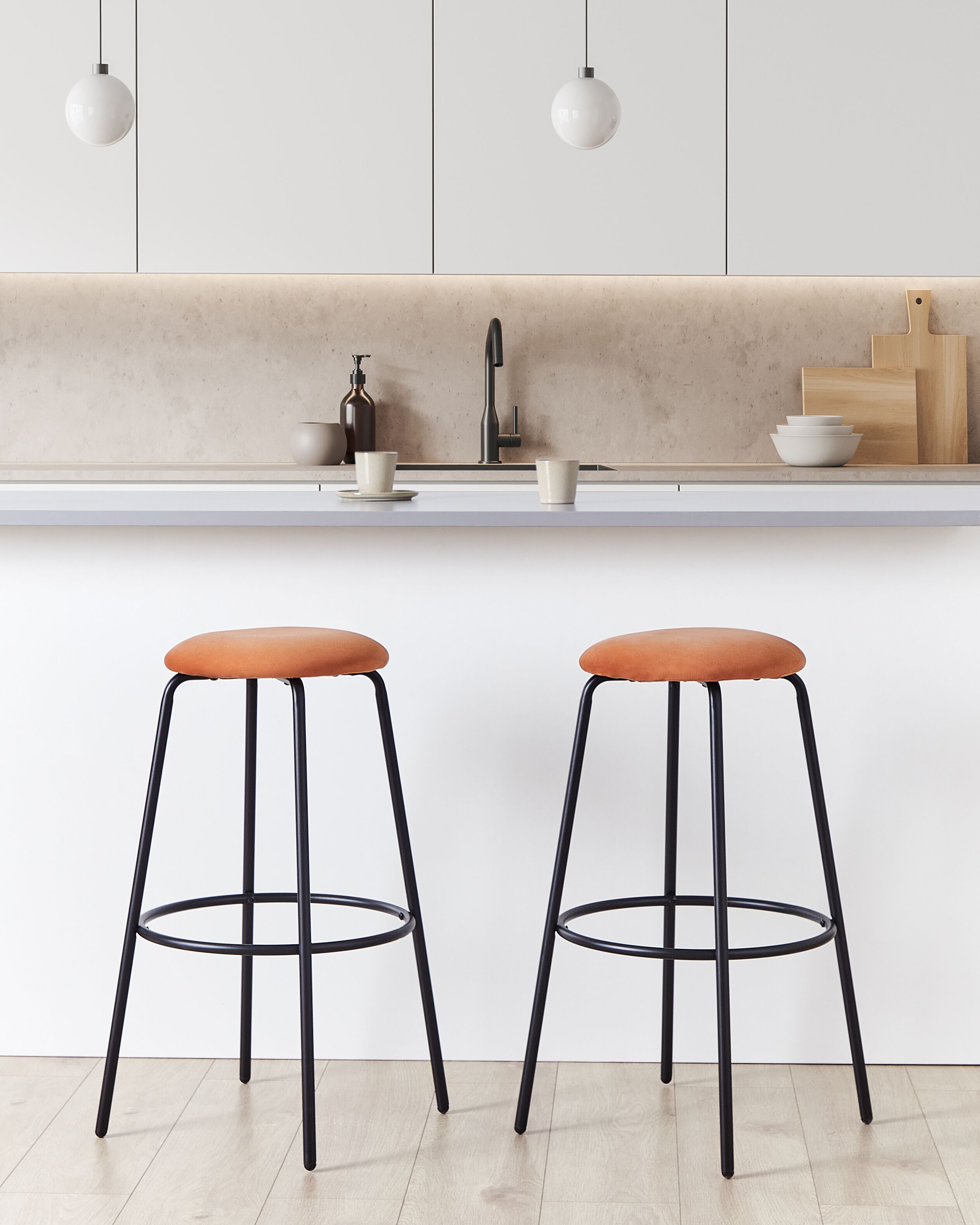Minimalistinen jakkarasetti. Kohota keittiön tai ruokailutilan tunnelmaa kahden baarijakkaran setillä, joka tuo tilaan sekä tyyliä että mukavuutta. Niiden istuimet on verhoiltu pehmeällä samettikankaalla, joka tarjoaa ylellisen istumakokemuksen. Tyylikkäät mustat teräsjalat eivät ainoastaan tarjoa kestävää tukea, vaan myös lisäävät modernia ilmettä kaikkiin sisustuksiin. Lisäksi voit käyttää niitä huoletta, sillä kätevät suojatapit suojaavat pintoja naarmuilta. Päivitä keittiötasoa näillä tyylikkäillä jakkaroilla, jotka huokuvat minimalistista retrotyyliä.
